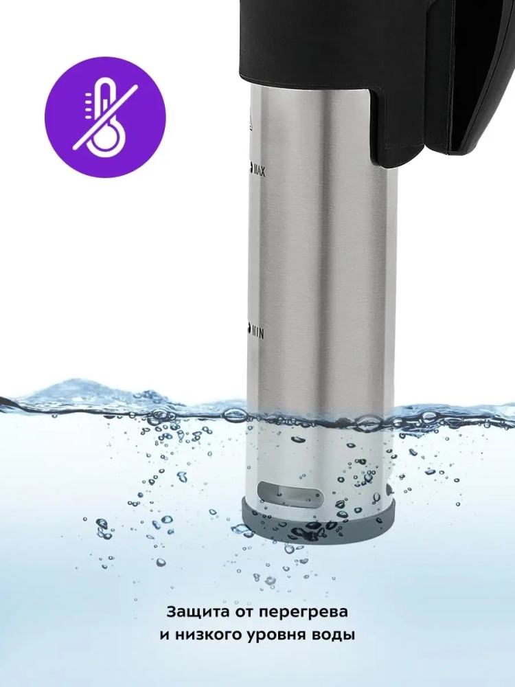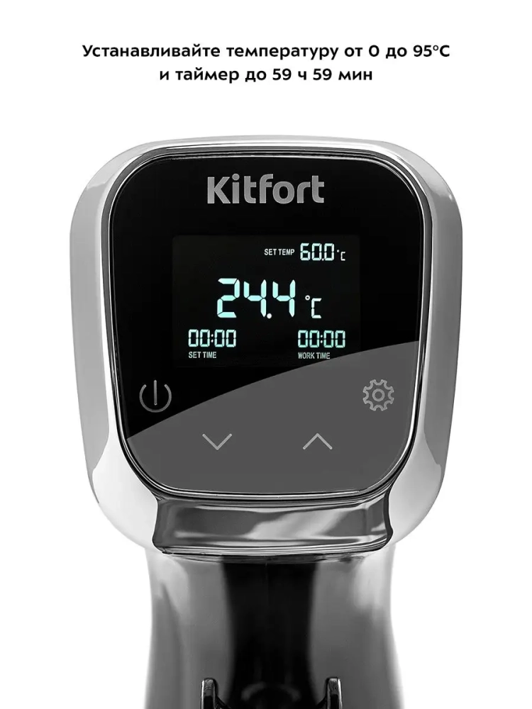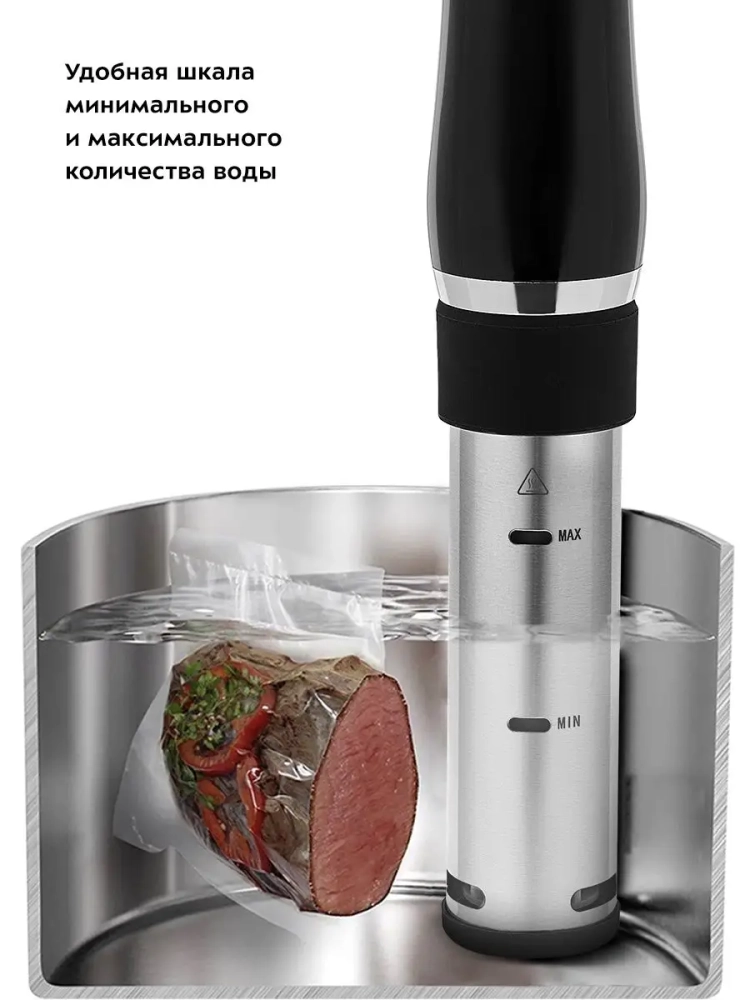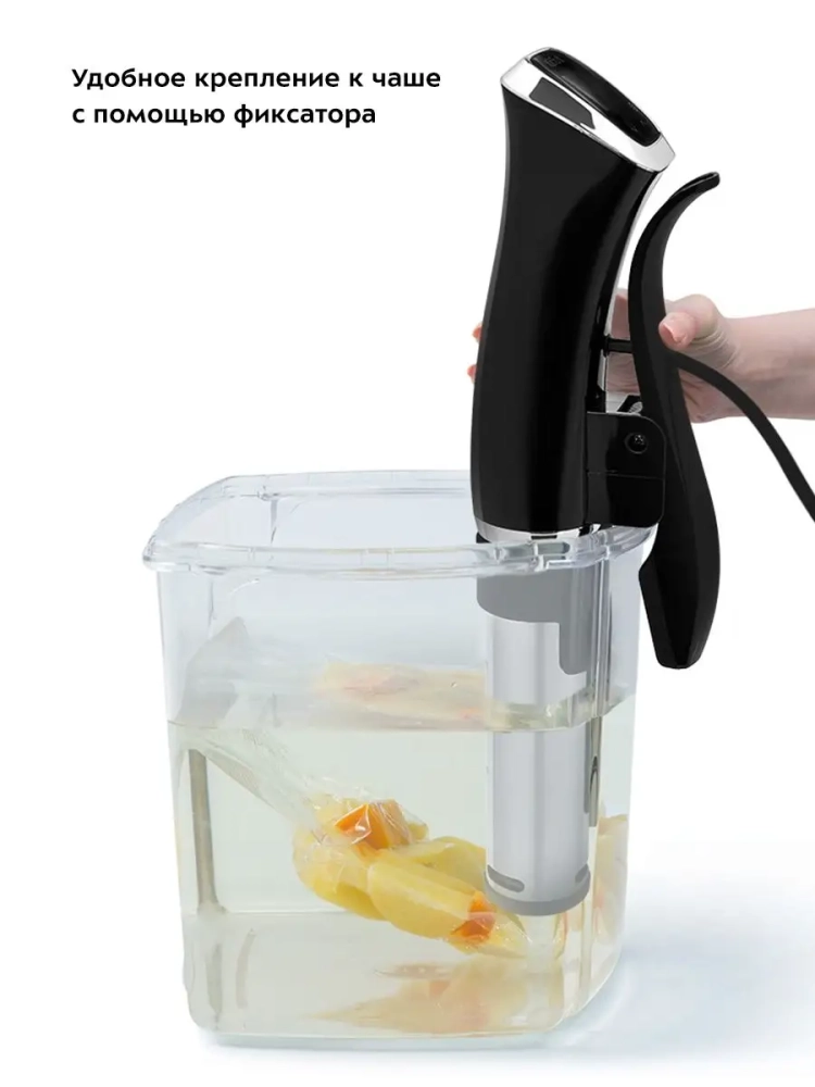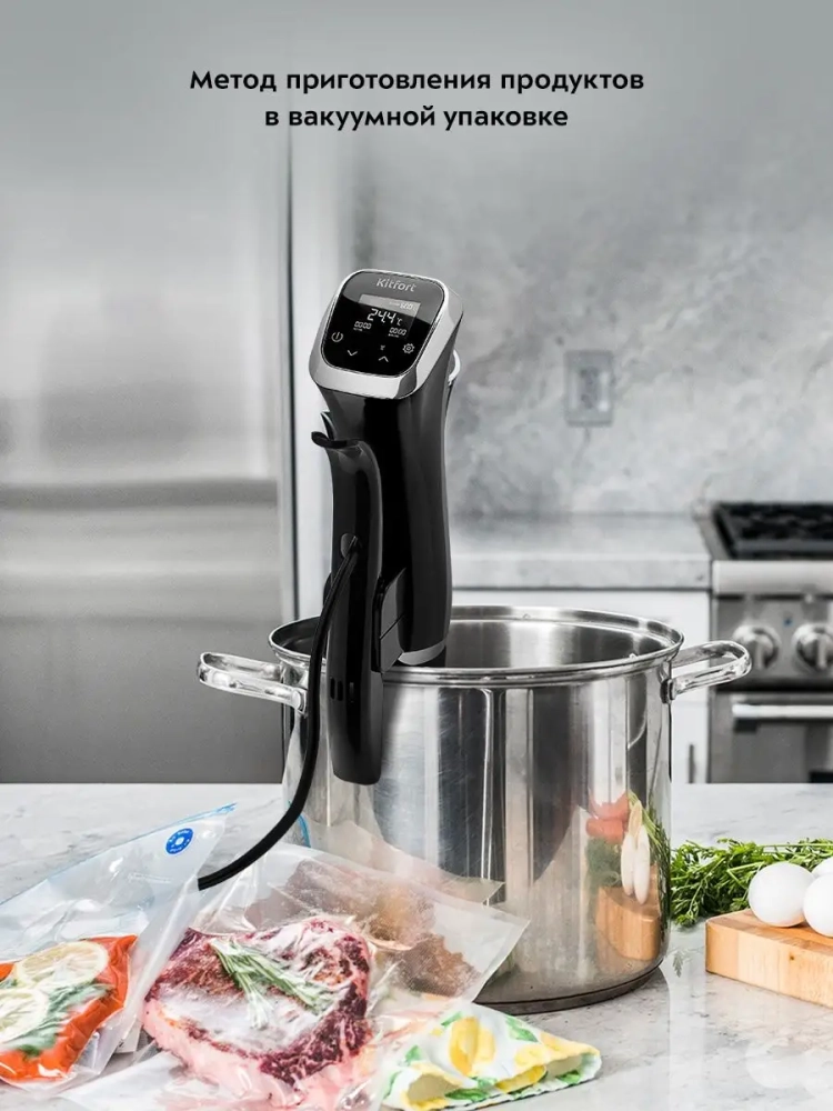 Погружной су-вид Kitfort КТ-4060 предназначен для приготовления пищи в вакуумных герметичных пакетах, помещенных в чашу с водой.