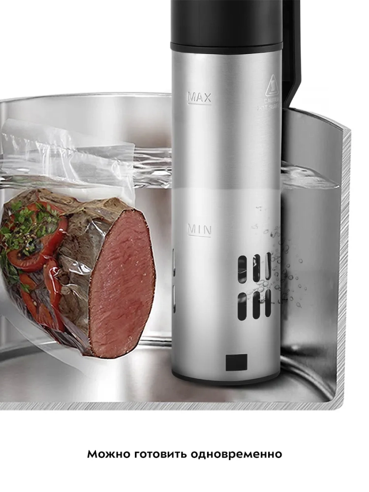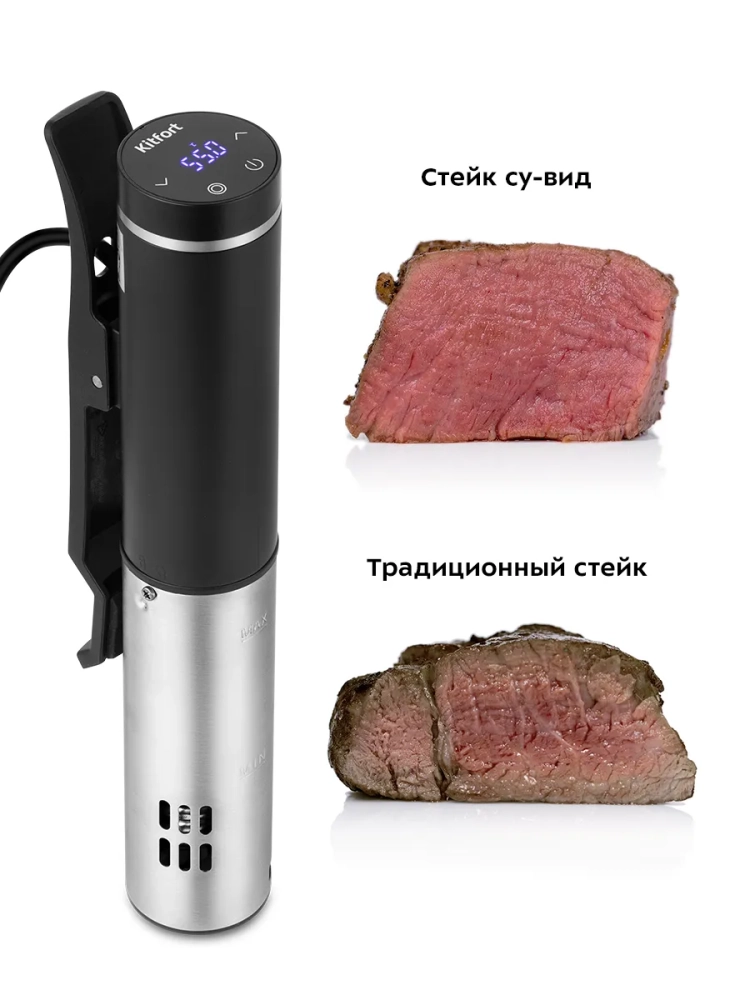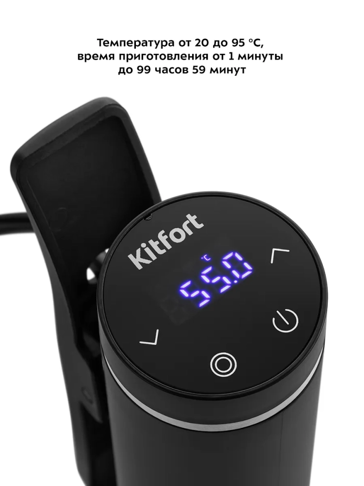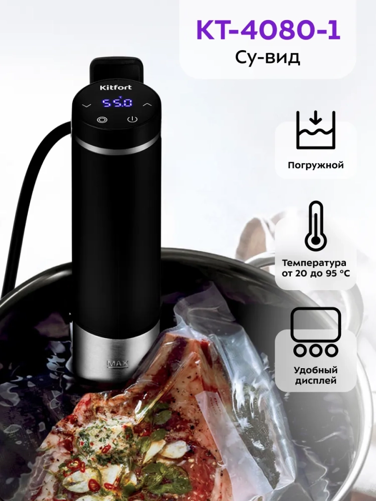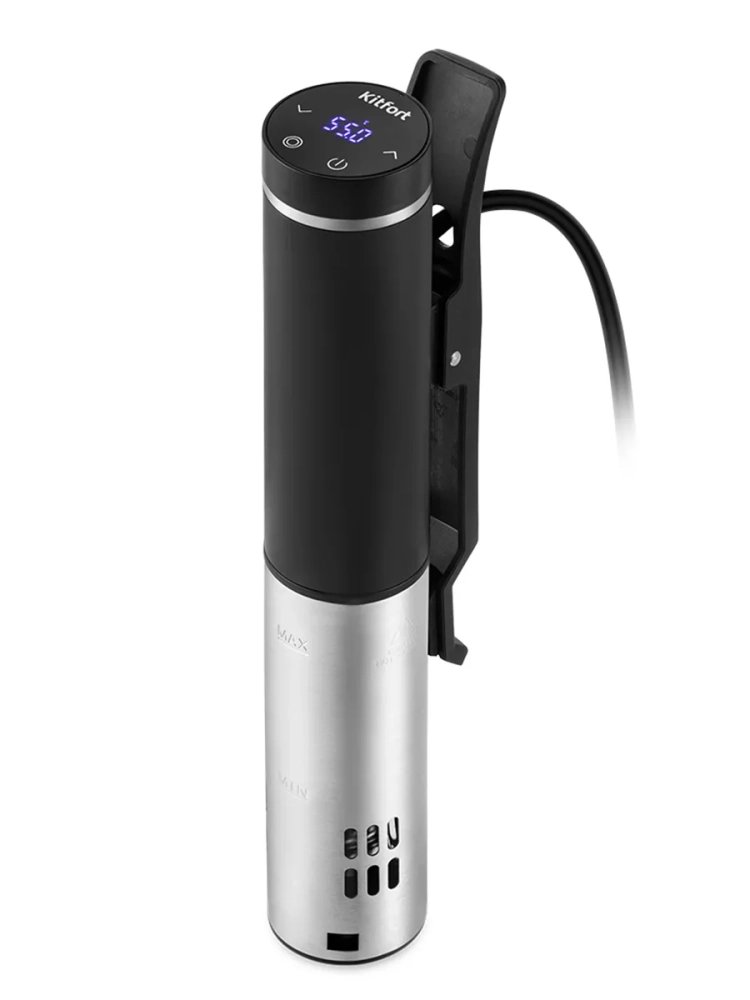 Погружной су-вид Kitfort КТ-4080 предназначен для приготовления пищи в вакуумных герметичных пакетах, помещенных в емкость с водой.