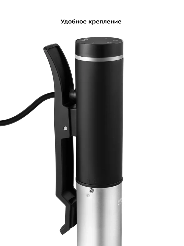 Нижнюю часть прибора погружают в кастрюлю с водой, а верхнюю часть крепят с помощью фиксатора к кастрюле. На корпусе прибора расположена панель управления, с помощью которой можно установить температуру от 20 до 95 *С с шагом установки 0,5 *С. Время приготовления можно установить от 1 минуты до 99 часов 59 минут. Шаг для минут — 1 минута, шаг для часов — 1 час.