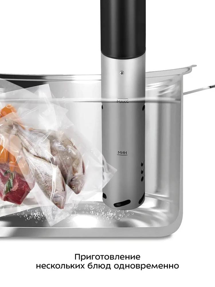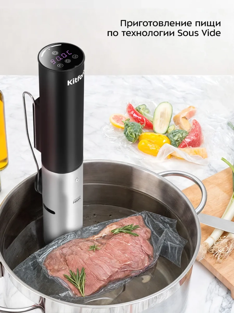 Погружной су-вид Kitfort КТ-6416 предназначен для приготовления пищи в вакуумных герметичных пакетах, помещенных в чашу с водой.