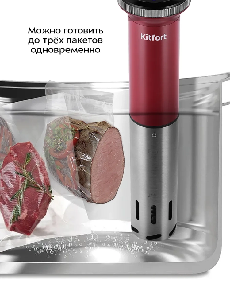 Погружной су-вид Kitfort КТ-6417 предназначен для приготовления пищи в вакуумных герметичных пакетах, помещенных в чашу с водой.