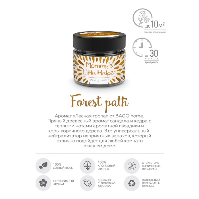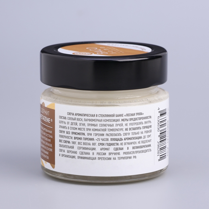 Ароматическая свеча "Лесная тропа" от BAGO home изготавливается из 100% органического и биоразлагаемого соевого воска, который не выделяет вредных веществ при горении. Соевый воск - это биологически и экологически чистый продукт, не содержащий продуктов нефтепереработки, свечи из соевого воска абсолютно безопасны, при горении такие свечи не повышают уровень CO2 в воздухе.