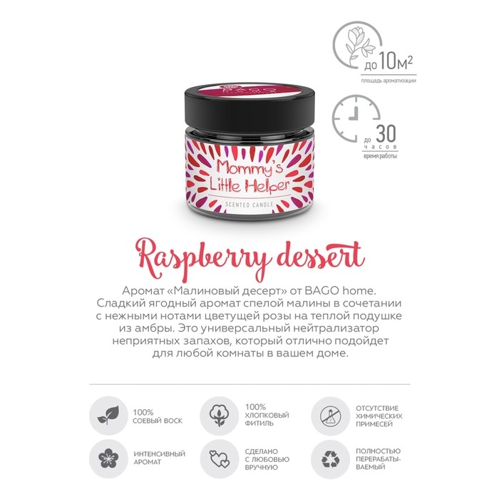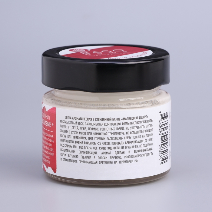 Ароматическая свеча "Малиновый десерт" от BAGO home изготавливается из 100% органического и биоразлагаемого соевого воска, который не выделяет вредных веществ при горении. Соевый воск - это биологически и экологически чистый продукт, не содержащий продуктов нефтепереработки, свечи из соевого воска абсолютно безопасны, при горении такие свечи не повышают уровень CO2 в воздухе.