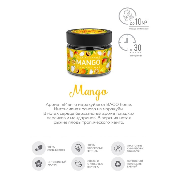 Ароматическая свеча "Манго маракуйя" от BAGO home — это ваш личный ключ к тропическому райскому саду, прямо у вас дома. Разработана для создания уникальной атмосферы, эта свеча из соевого воска высочайшего качества обеспечивает до 25 часов насыщенного и чистого горения, охватывая площадь в 20 м² своим бодрящим ароматом.