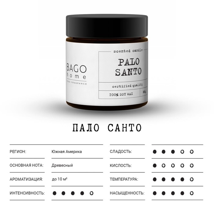 Ароматические свечи BAGO home изготавливаются из 100% органического и биоразлагаемого соевого воска, который не выделяет вредных веществ при горении. Соевый воск - это биологически и экологически чистый продукт, не содержащий продуктов нефтепереработки, свечи из соевого воска абсолютно безопасны, при горении такие свечи не повышают уровень CO2 в воздухе.
