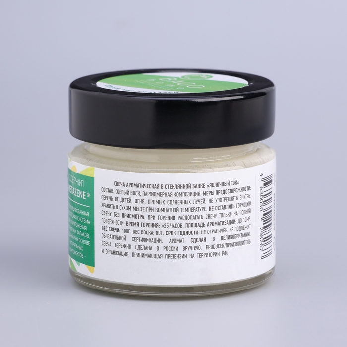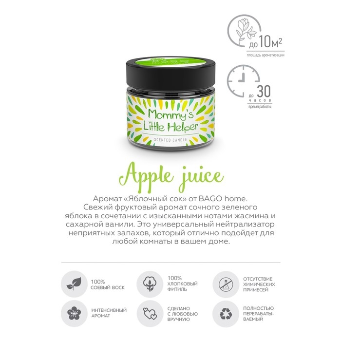 Ароматическая свеча "Яблочный сок" от BAGO home изготавливается из 100% органического и биоразлагаемого соевого воска, который не выделяет вредных веществ при горении. Соевый воск - это биологически и экологически чистый продукт, не содержащий продуктов нефтепереработки, свечи из соевого воска абсолютно безопасны, при горении такие свечи не повышают уровень CO2 в воздухе.