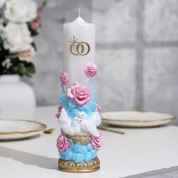 Свеча-цилиндр фигурная свадебная "Голуби в розах", разноцветная, 26,5х8 см, домашний очаг