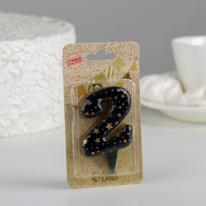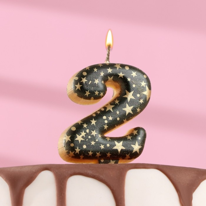 Свеча в торт "Саната", цифра "2", черная с золотыми звездами, 5,5 см