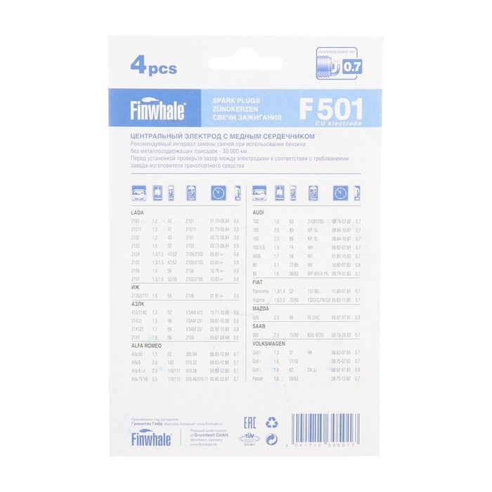 Свечи зажигания Finwhale F501 2101-07, набор 4 шт аналог: 241235563, W20EP-U, 2166