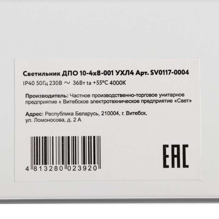 Светильник ДПО 10-4х8-001, УХЛ4, ОПАЛ 4000К, 3200 Лм, IP40