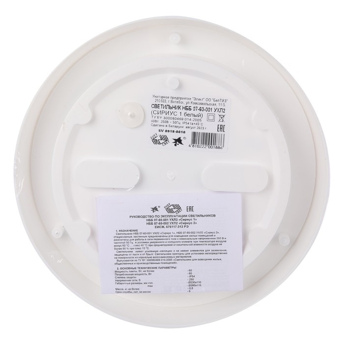 Светильник НББ 07-60-001, Сириус 1, УХЛ2, IP54, Е27, 220В, 50гц, 60Вт, d230хh110, белый