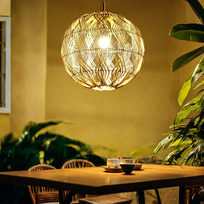 Этнический светильник ручной работы сделан из экоматериала — ротанга (очищенных и высушенных стеблей лиан).
