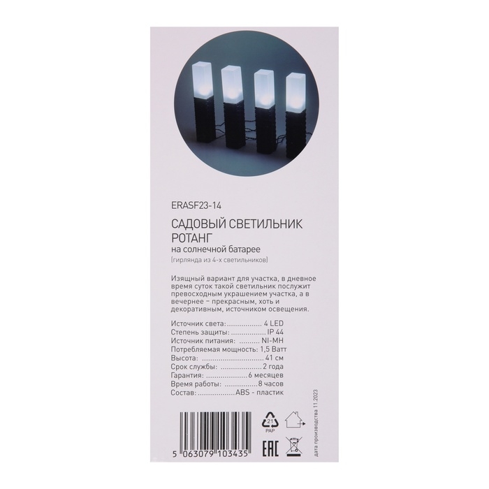 Светильник уличный ЭРА ERASF23-14 Ротанг на солнечной батарее высота 41 см 4 шт 4 LED