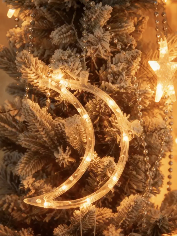 Длина гирлянды: 3м. Длина шнура: 90см. Длина луны: 18см. Длина звезды: 10 см. Комплектация: гирлянда состоит из 6 лун и 6 звезд, led-лампочки по периметру, 2 вилки: для подключения в розетку 220В и для соединения гирлянд между собой. Цвет свечения: золотистый, теплый белый.