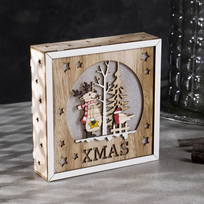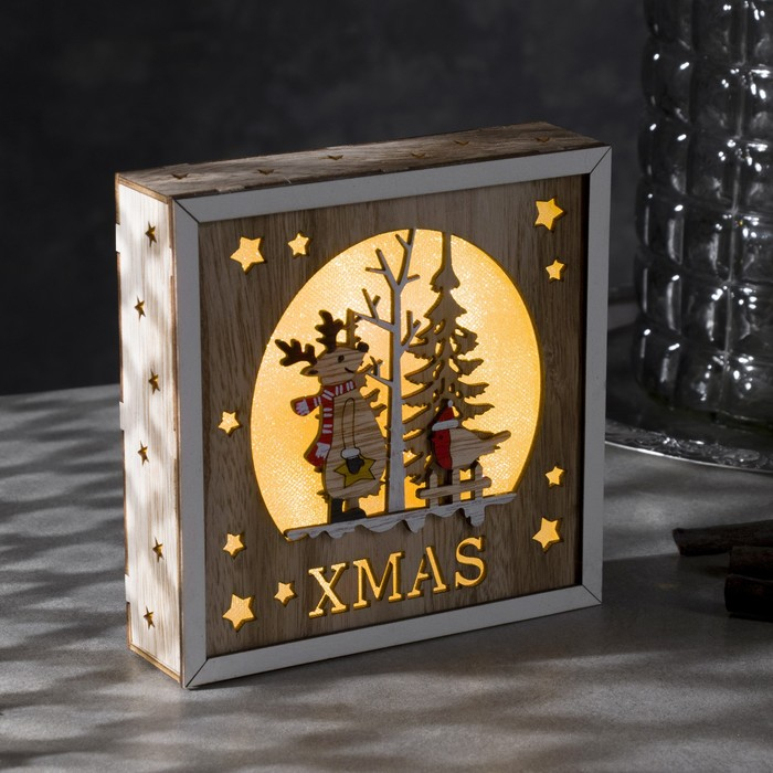 Светодиодная фигура «Олень и снегирь» 15 × 15 × 4 см, дерево, батарейки АААх2 (не в комплекте), свечение тёплое белое