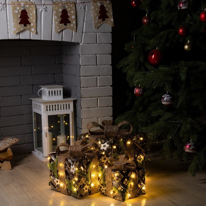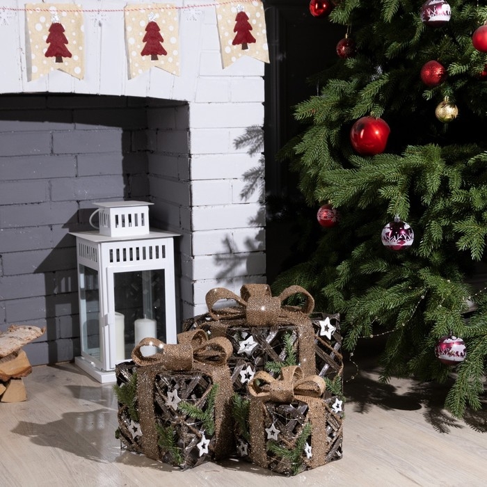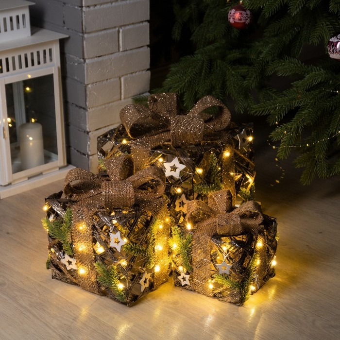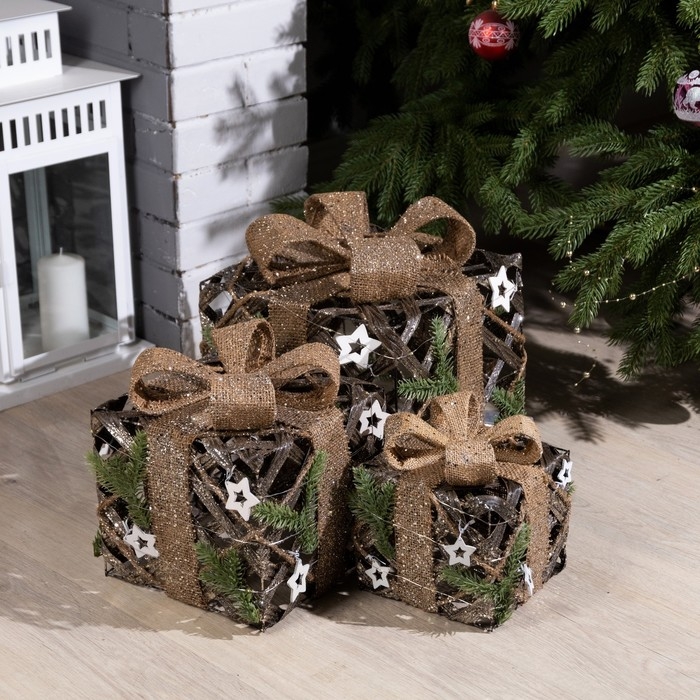 Светодиодная фигура «Подарки плетёные» 15, 20, 25 см, текстиль, металл, батарейки ААх2 (не в комплекте), свечение тёплое белое