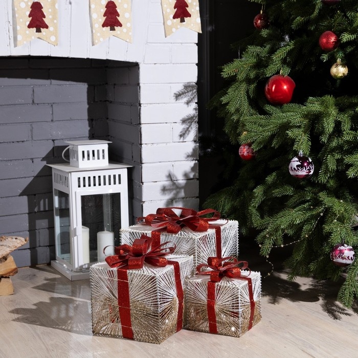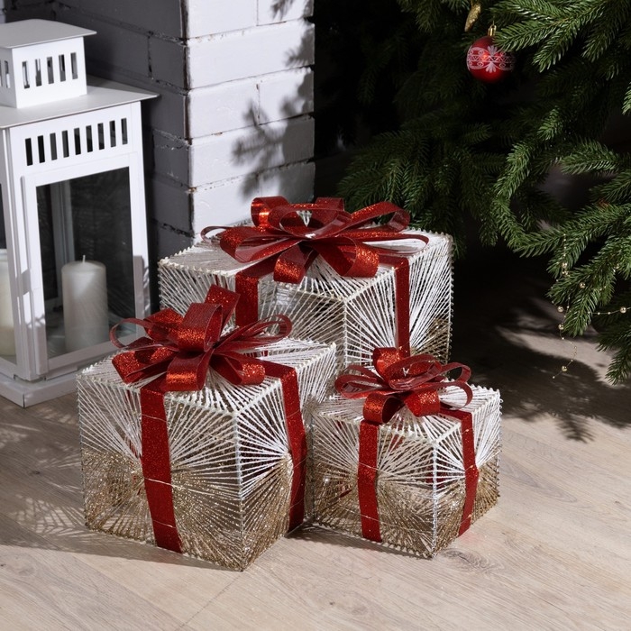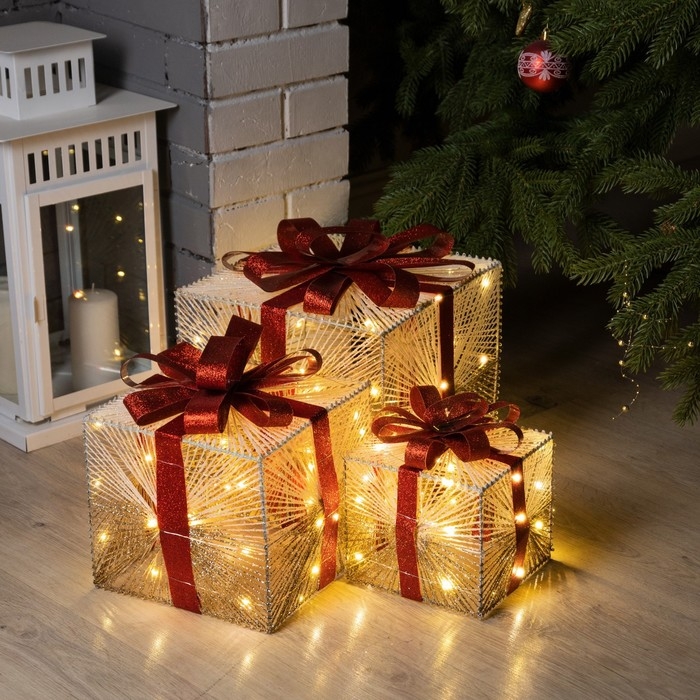 Светодиодная фигура «Подарки с золотистой нитью» 15, 20, 25 см, текстиль, металл, батарейки ААх2 (не в комплекте), свечение тёплое белое