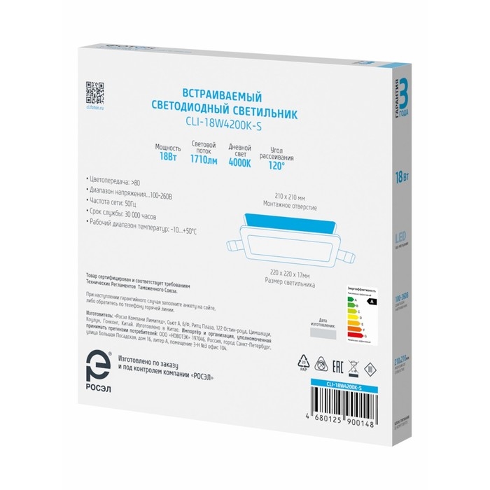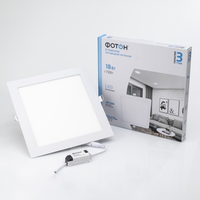 Светодиодный встраиваемый светильник ФОТОН квадратный CLI-18W4200K-S предназначен для общего и акцентного освещения внутри жилых и административных помещений. Широкий диапазон рабочих напряжений. Стабильно ровный световой поток в напряжениях от 100 В до 260 В. Безопасен для зрения и здоровья благодаря низкому уровню пульсации светового потока (менее 5%) в течение всего срока службы. Ультратонкий дизайн. Встраиваемый светильник выполнен в узком корпусе и подходит для установки в помещениях с ограниченным потолочным пространством.