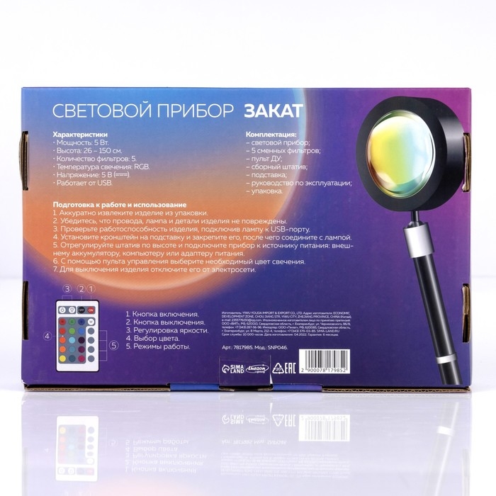 Световой прибор «Закат», 5 картриджей, регулировка высоты, свечение мульти (RGB), 5 В