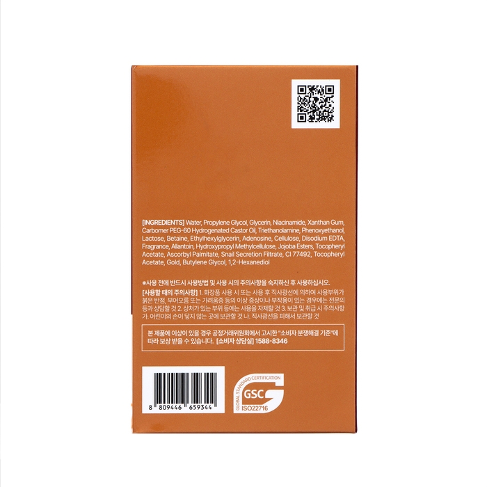 Состав: Water, Propylene Glycol, Glycerin, Niacinamide, Xanthan Gum, Carbomer PEG-60 Hydrogenated Castor Oil, Triethanolamine, Phenoxyethanol, Lactose, Betaine, Ethylhexylglycerin, Adenosine, Cellulose, Disodium EDTA, Fragrance, Allantoin, Hydroxypropyl Methylcellulose, Jojoba Esters, Tocopheryl Acetate, Ascorbyl Palmitate, Snail Secretion Filtrate, CI 77492, Tocopheryl Acetate, Gold, Butylene Glycol, 1,2-Hexanediol.