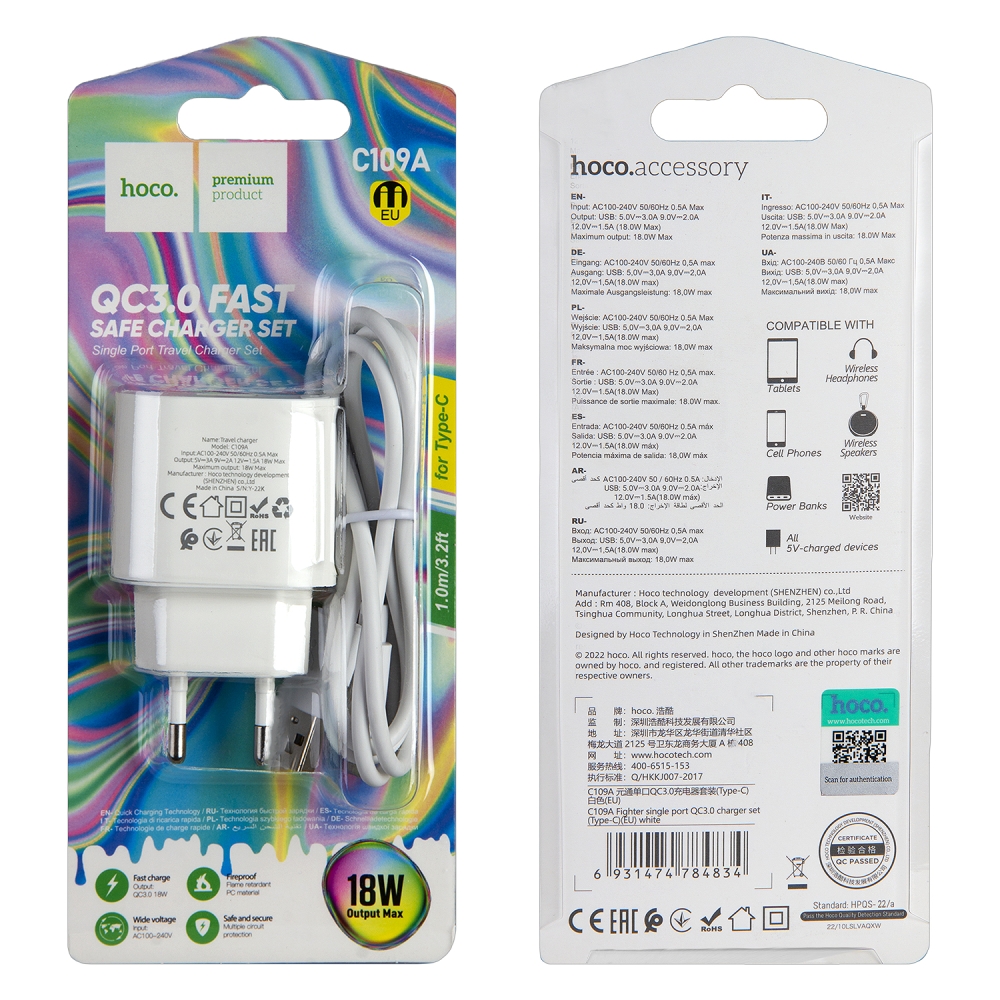СЗУ C109A USB на Type-C 3A HOCO белое