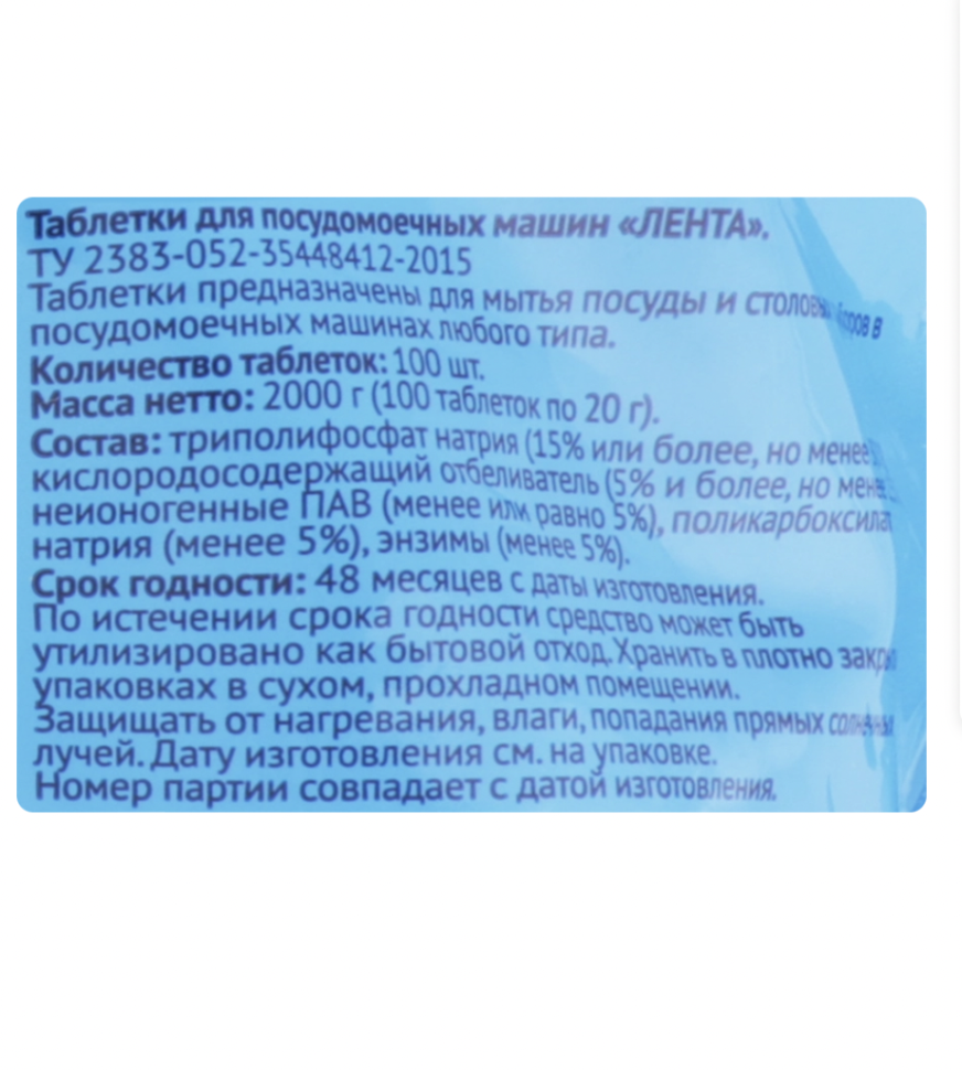 В упаковке 100x254x290 мм (ДxШxВ), вес 950 г Полное название товара (у поставщика) Таблетки для посудомоечных машин ЛЕНТА в водорастворимой оболочке, 100шт Способ применения, дозировка Берите таблетки только сухими руками, не снимая защитной прозрачной пленки, положите ее в сухой отсек для моющих средств. Закройте отсек и пользуйтесь машиной как обычно. Для одной мойки достаточно одной таблетки. При сильном загрязнении установите температуру +65 градусов. Информация для аллергиков Содержит вещества, которые могут стать причиной аллергических реакций. Производитель ООО «Глорус-Норд» Количество штук в упаковке 100 Меры предосторожности Всегда закрывайте упаковку после использования. Не употреблять внутрь. Избегать попадания в глаза, может вызвать раздражение. При попадании в глаза промыть немедленно большим количеством воды и обратиться к врачу. При проглатывании немедленно обратиться к врачу и показать этикетку. Условия хранения В плотно закрытых упаковках в сухом, прохладном помещении отдельно от пищевых продуктов, в местах недоступных для детей. Защищать от нагревания, влаги, попадания прямых солнечных лучей. Таблетки для посудомоечных машин ЛЕНТА в водорастворимой оболочке – мощная и бережная очистка. Средство обеззараживает активным кислородом, смягчает жесткую воду. Таблетки защищают от накипи и коррозии,от известкового налета, эффективно удаляют жир и нагар. Придают блеск, защищает металлическую посуду от потускнения. Содержат активный кислород и специальные добавки для смягчения воды. Предотвращают появление накипи. Содержит энзимы для растворения жиров, белков и крахмалов, ингибитор коррозии. Не рекомендуется мыть в посудомоечной машине фарфор, посуду из хрусталя, серебра, алюминия, мельхиора, меди, латуни, дерева, а также посуду, декорированную серебром и позолотой. Состав: Триполифосфат натрия (15% или более, но менее 30%), кислородосодержащий отбеливатель (5% и более, но менее 15%), неионогенные ПАВменее или равно 5%, поликарбоксилат натрия (менее 5%), энзимы (менее 5%).