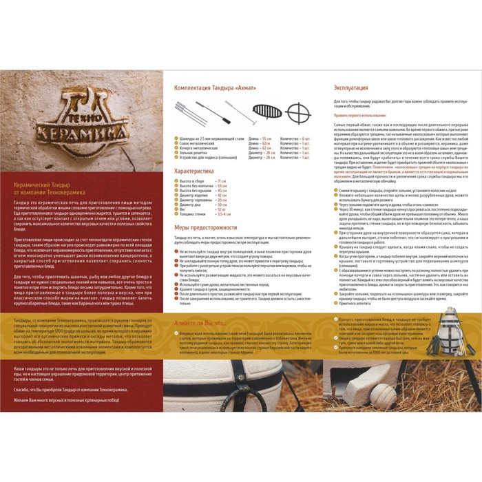 Тандыр "Ахмат" - это керамическая печь, которая в разогретом состоянии держит тепло в течение 1,5-2 часов. Хотя тандыр имеет небольшой объём, но за счёт его толстых стенок можно приготовить за один розжиг до 2-3 кг. мяса и много разных блюд.