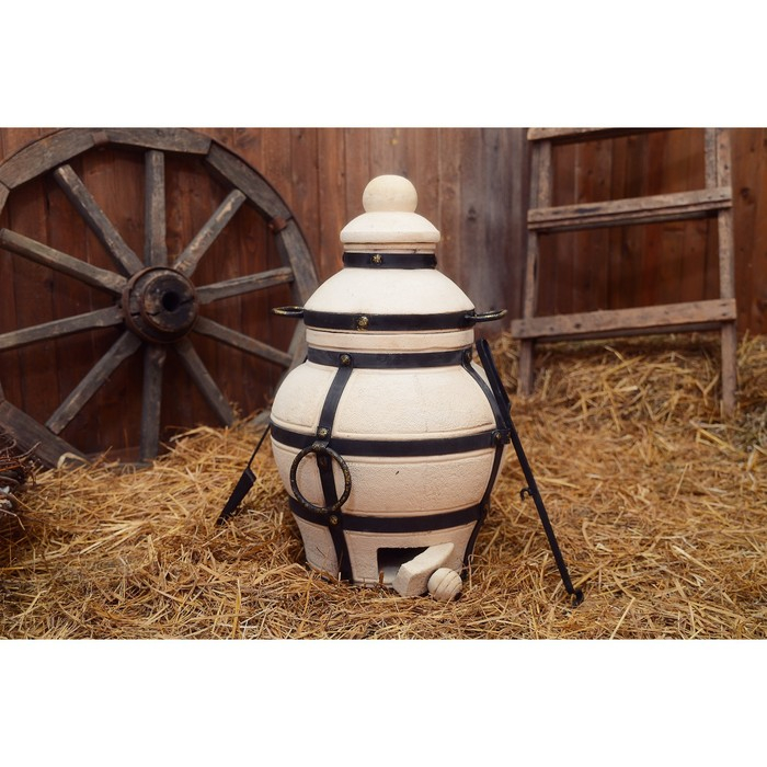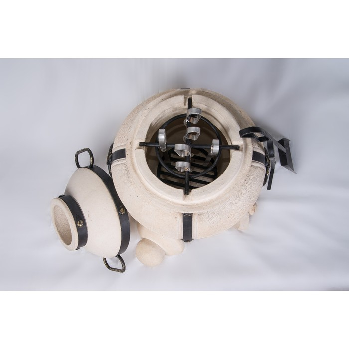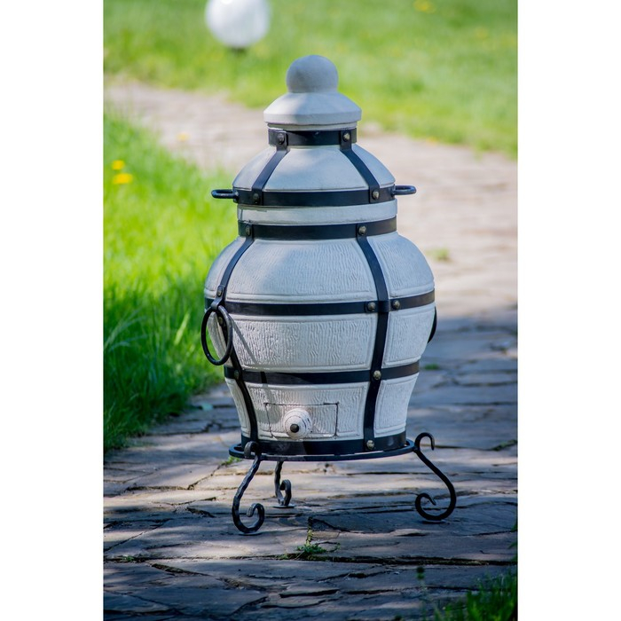 Кованная подставка обеспечивает удобное использование. Красоту тандыру придаёт интересный орнаментальный растительный узор, расположенный в центральной его части.