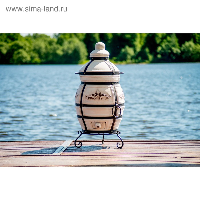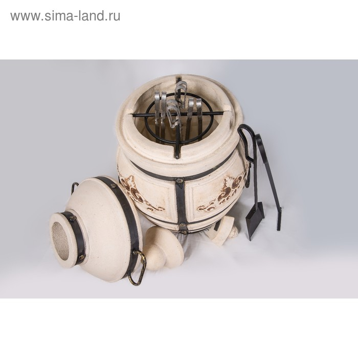Кованная подставка обеспечивает удобное использование. Красоту тандыру придаёт интересный орнаментальный растительный узор, расположенный в центральной его части.