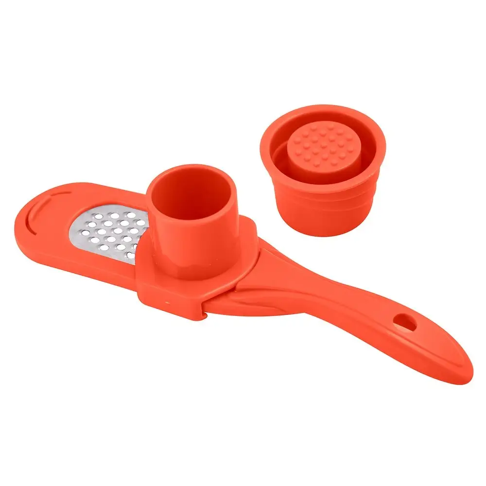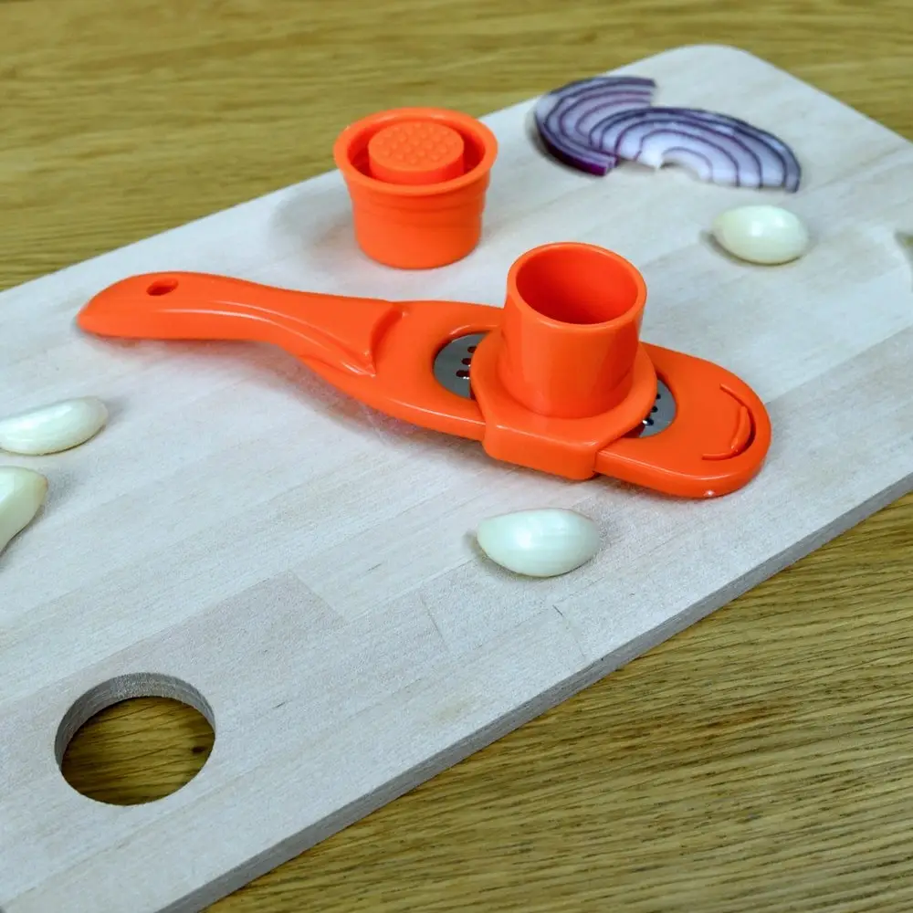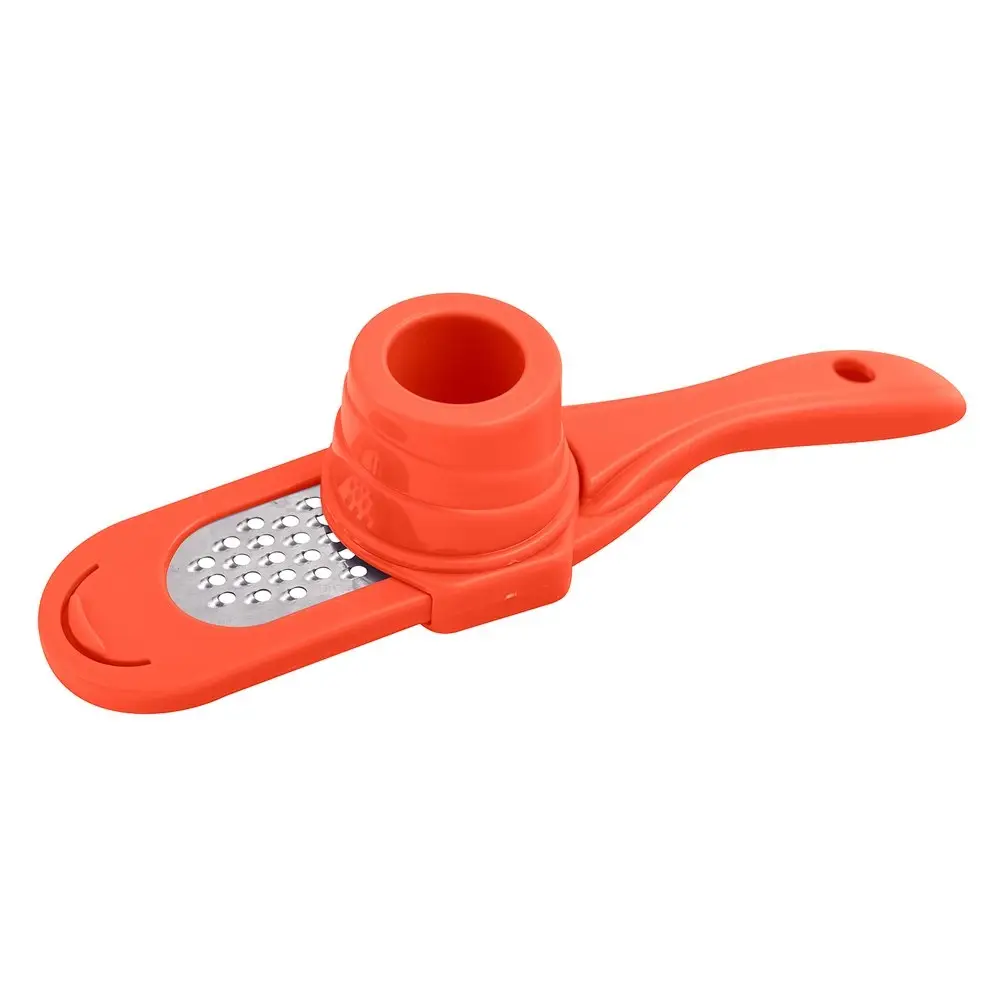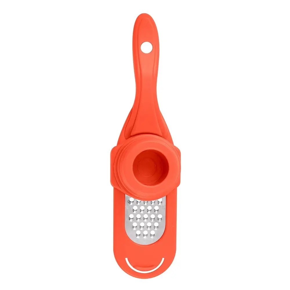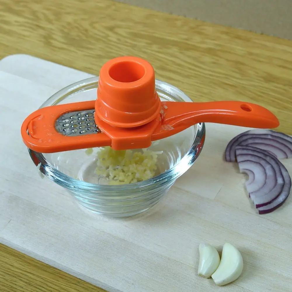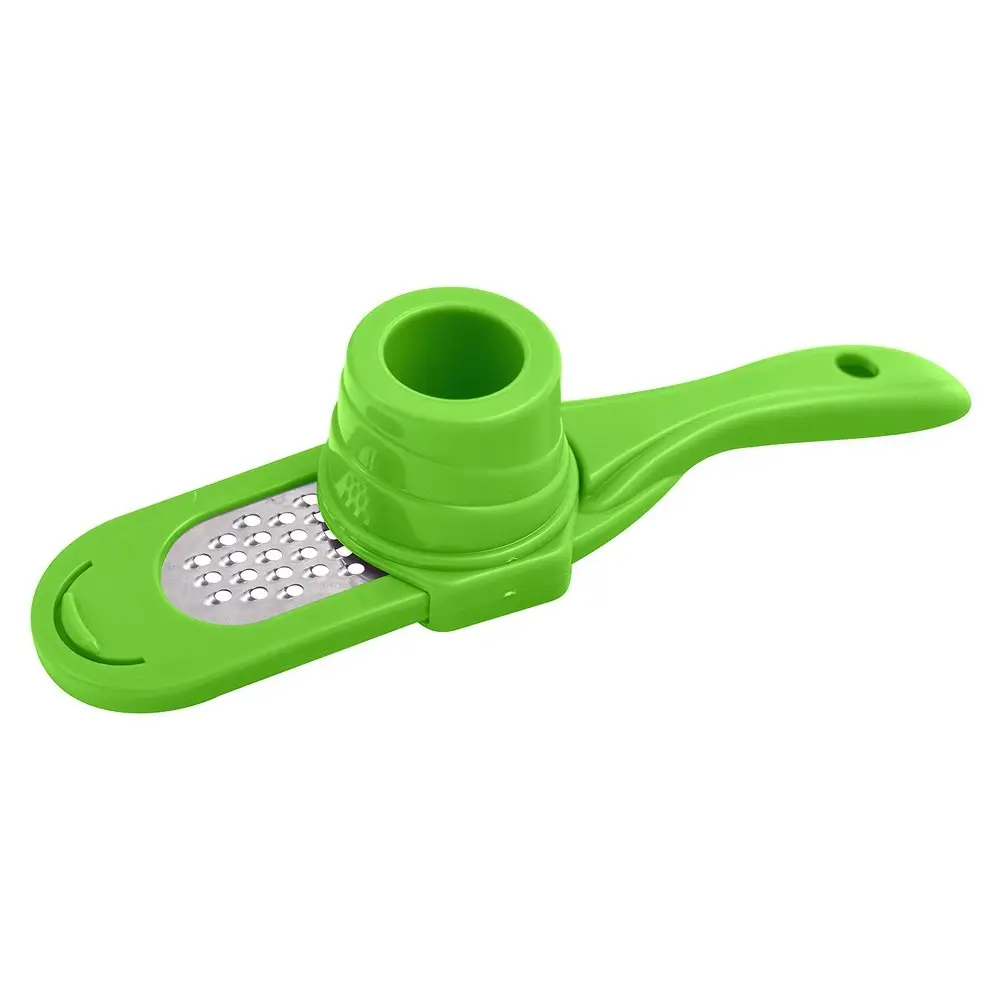 Компактная тёрка со своим контейнером, разработана специально для чеснока, а также др. мелких продуктов - имбиря, мускатного ореха и т.п. Тёрка изготовлена из нержавеющей стали, корпус пластиковый. Тёрка для чеснока является безопасным девайсом. Приспособление состоит из трёх частей: плоской мини тёрки, контейнера, закреплённого на тёрке и плавно скользящего вдоль рабочей поверхности тёрки и держателя-толкателя, с помощью которого продукт удерживается под пластиковым колпаком-предохранителем, не допуская непосредственного контакта рук с режущими элементами тёрки. Пользоваться ей очень удобно - в цилиндр помещаете зубчик чеснока, закрываете его пресс-колпачком и начинаете тереть. В результате руки чистые и головка чеснока потёрта до последнего волокна, благодаря чему не остаётся запаха на руках. Тёрка для чеснока с контейнером пригодится для сервировки праздничного стола и приготовления любых блюд. Тёрка с контейнером для чеснока, имбиря, орехов и сыра станет для вас отличным помощником на кухне, а также подойдёт в виде подарка вашим родным и близким. После использования промойте изделие щёткой под проточной водой, можно с использованием жидких моющих средств. Можно мыть в посудомоечной машине.