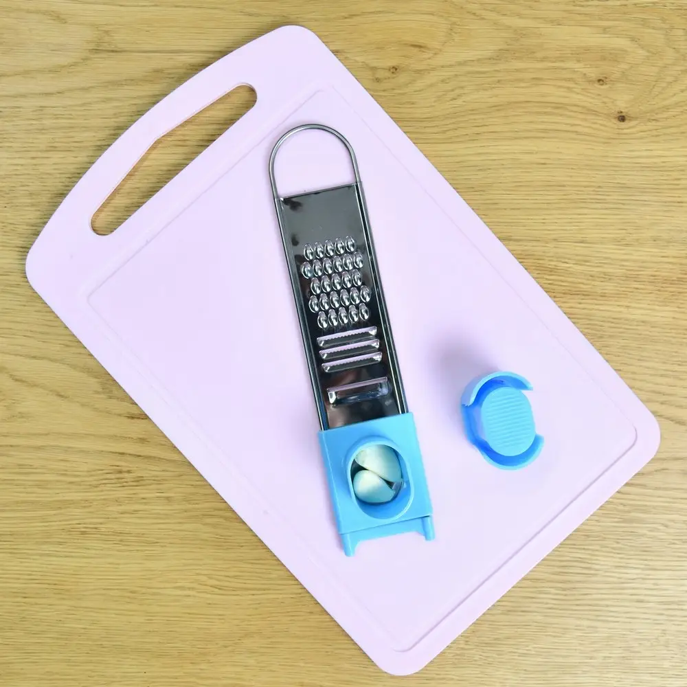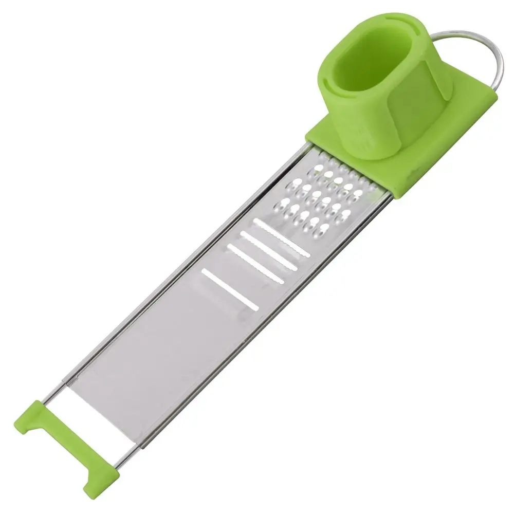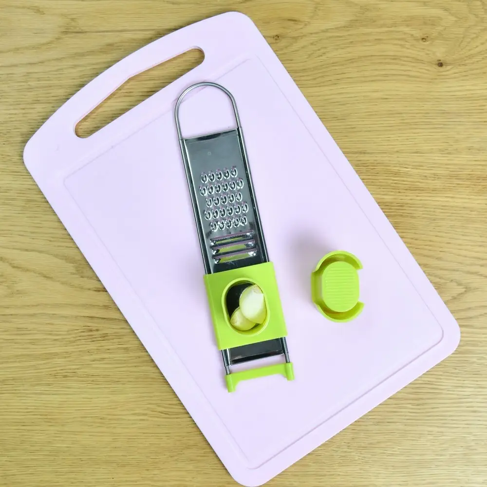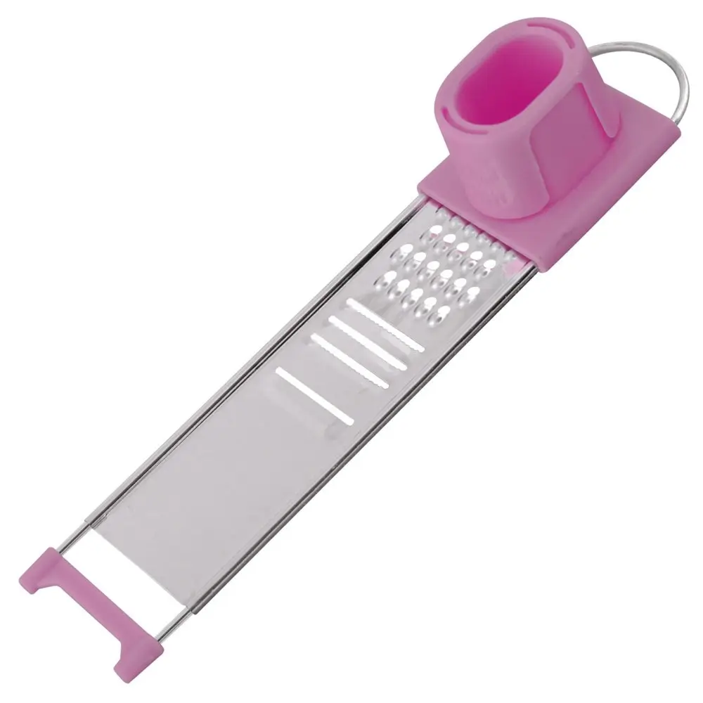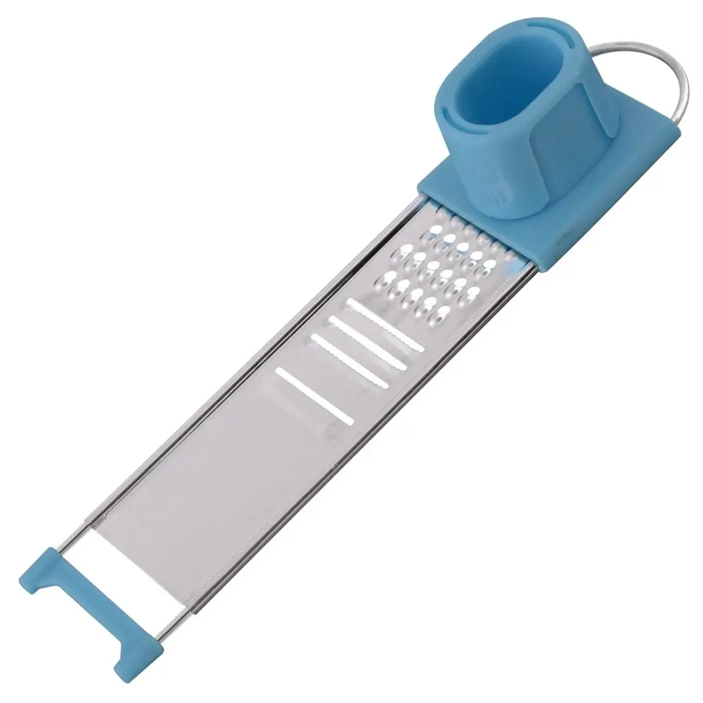 Предназначена для измельчения чеснока, а также других мелких продуктов - имбиря, мускатного ореха и т.п. Приспособление состоит из трех частей: плоской мини терки, контейнера, закрепленного на терке и плавно скользящего вдоль рабочей поверхности терки и держателя-толкателя, с помощью которого продукт удерживается под пластиковым колпаком-предохранителем, не допуская непосредственного контакта рук с режущими элементами терки. Изготовлено: коррозионностойкая (нержавеющая) сталь, пластмасса (полипропилен). Размер: 22,5*4,5*4см.