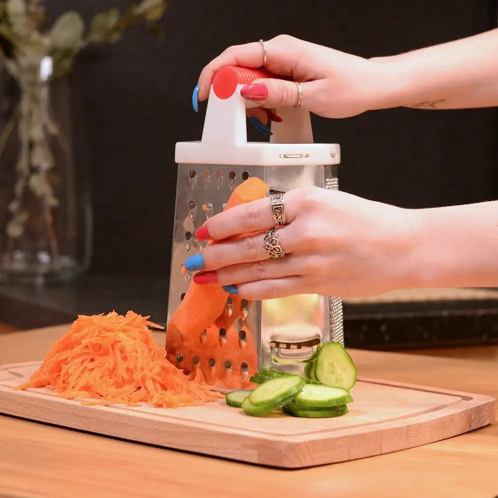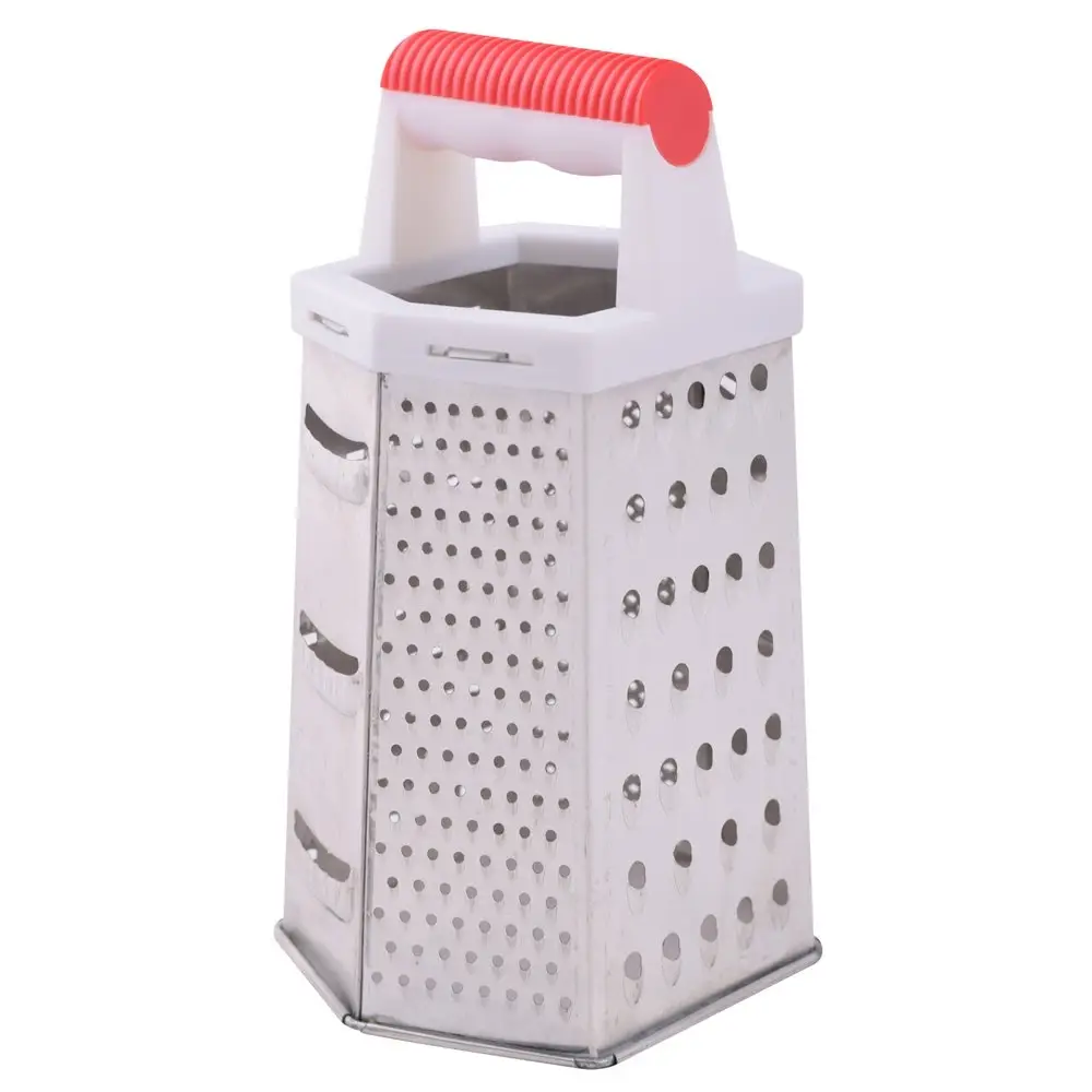 Шестигранная терка предназначена для измельчения продуктов. На стенках изделия расположены отверстия 6-ти типов: мелкого, среднего и крупного размеров, шинковка, фигурная шинковка и шредер. Для того, чтобы натереть продукт, установите терку на стол и держите за ручку одной рукой. Второй рукой приступайте к натиранию продуктов на нужном вам лезвии. Чтобы не повредить пальцы, натирайте только крупные куски. Рабочая поверхность выполнена из коррозионностойкой стали, ручка — из пластмассы, общая высота изделия 19 см. Уход за изделием прост: после использования промывайте водой, удаляя щеткой пищевые отходы.