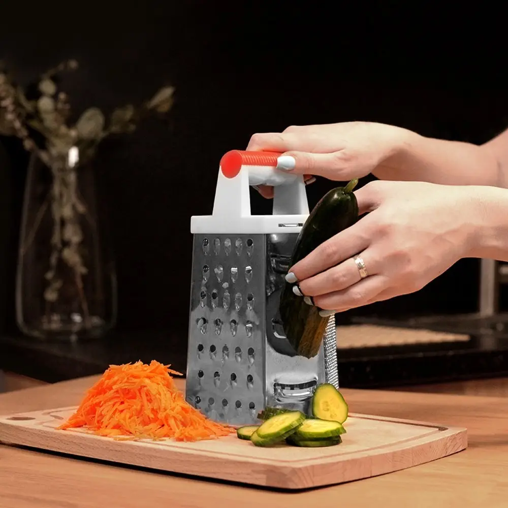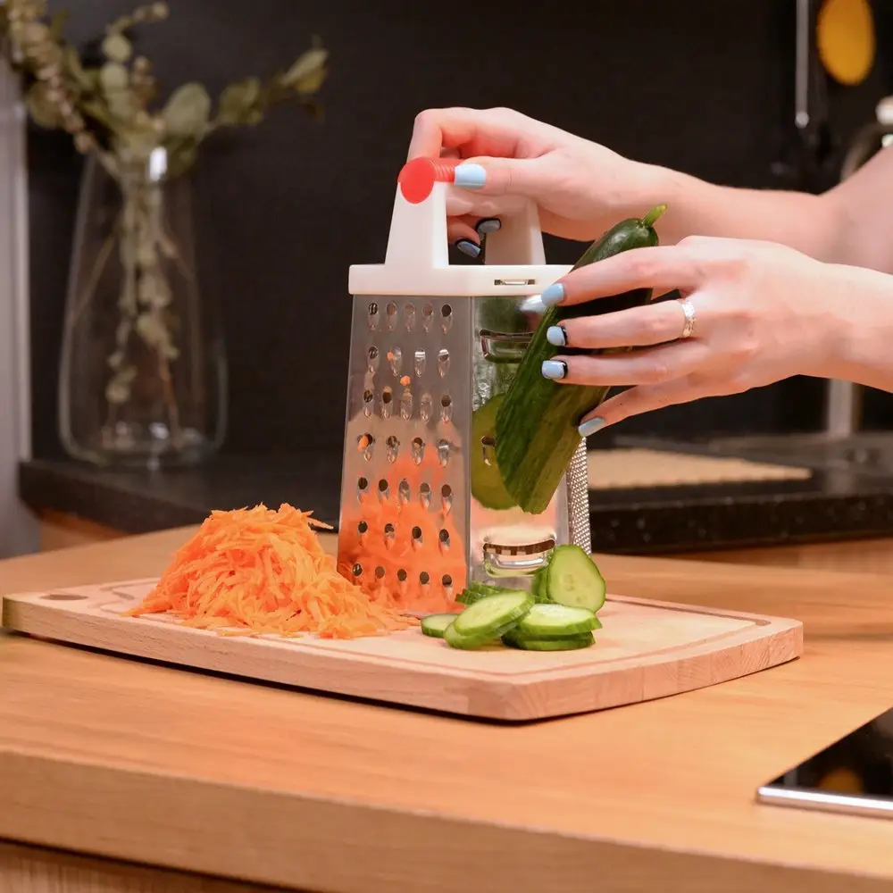 Для приготовления горячих блюд, салатов, закусок, украшения выпечки и кондитерских изделий очень часто нужно измельчить ингредиенты. Шестигранная терка – удобное кухонное приспособление с отверстиями и насечками шести типов: мелкая и средняя терки, крупная терка, шинковка, фигурная шинковка и шредер. Пользоваться изделием легко: поставьте терку на стол, одной рукой держите за ручку. Второй рукой возьмите продукт, прижмите к нужной вам грани и начинайте тереть, направляя движения вниз. Натирайте только крупные части, чтобы не повредить пальцы. Рабочая поверхность выполнена из коррозионностойкой стали, ручка – из пластмассы, высота изделия 22 см. Уход за изделием прост: после использования промывайте водой, удаляя щеткой остатки пищи.