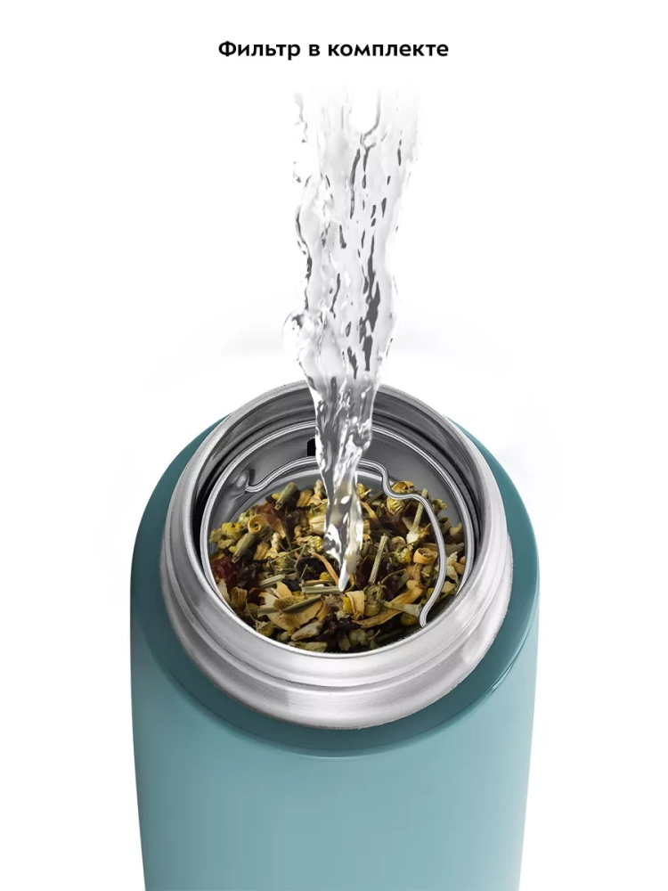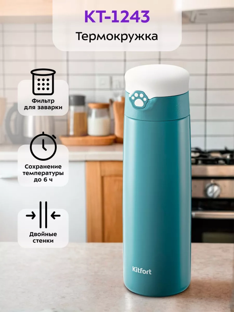 Термокружка Kitfort КТ-1243 предназначена для сохранения температуры напитков. Она может поддерживать температуру содержимого в течение примерно 6 часов. Фильтр позволит заваривать напитки с кусочками ингредиентов.