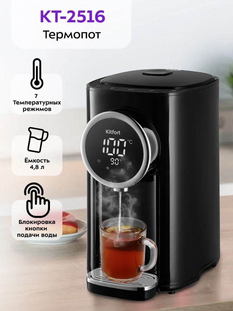 Термопот Kitfort КТ-2516 служит для подачи воды заданной температуры и поддержания температуры воды с помощью периодического включения и отключения нагрева. Отличие термопота от обычного чайника в том, что термопот поддерживает заданную температуру воды, поэтому у вас всегда есть горячая вода. Также удобно наливать воду благодаря автоматической подаче воды.