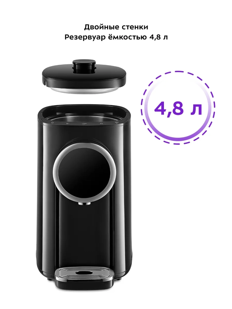 Двойные стенки термопота помогают сохранить тепло и реже включать нагрев, что поможет сэкономить на электроэнергии. Корпус термопота состоит из пластика, а резервуар — из нержавеющей стали. Внутренняя часть крышки также сделана из нержавеющей стали, поэтому вода не соприкасается с пластиковыми частями устройства. Термопот оснащен съемным поддоном для капель.