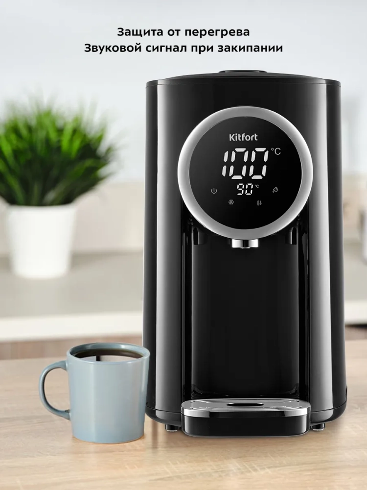 Термопот Китфорт оснащен функцией выбора температуры и может не только вскипятить воду, но и нагреть ее до температуры 45, 55, 65, 75, 85 и 95 °С, что очень удобно при заваривании различных сортов чая, приготовлении кофе и детского питания.