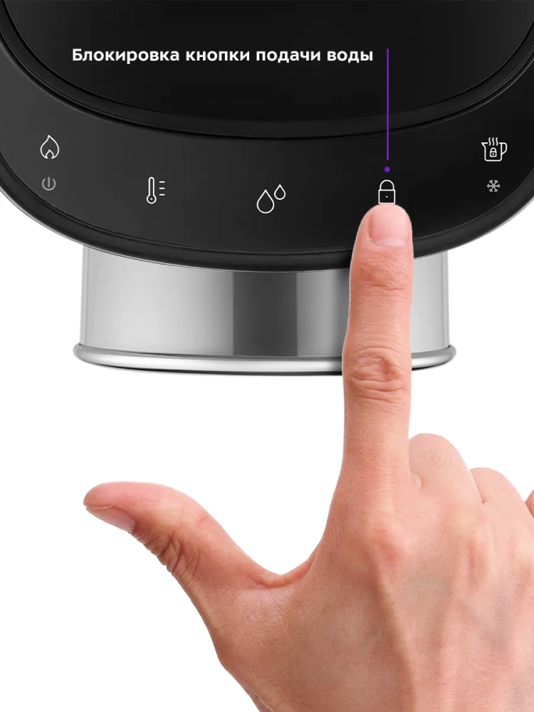 Блокировка кнопки подачи воды не позволит получить ожог при случайном включении подачи воды или испортить поверхность стола кипятком, а также защитит от случайного нажатия на кнопку детьми. Блокировка кнопки подачи воды включается автоматически после 10 секунд бездействия. Есть возможность отключить автоматическую блокировку этой кнопки.