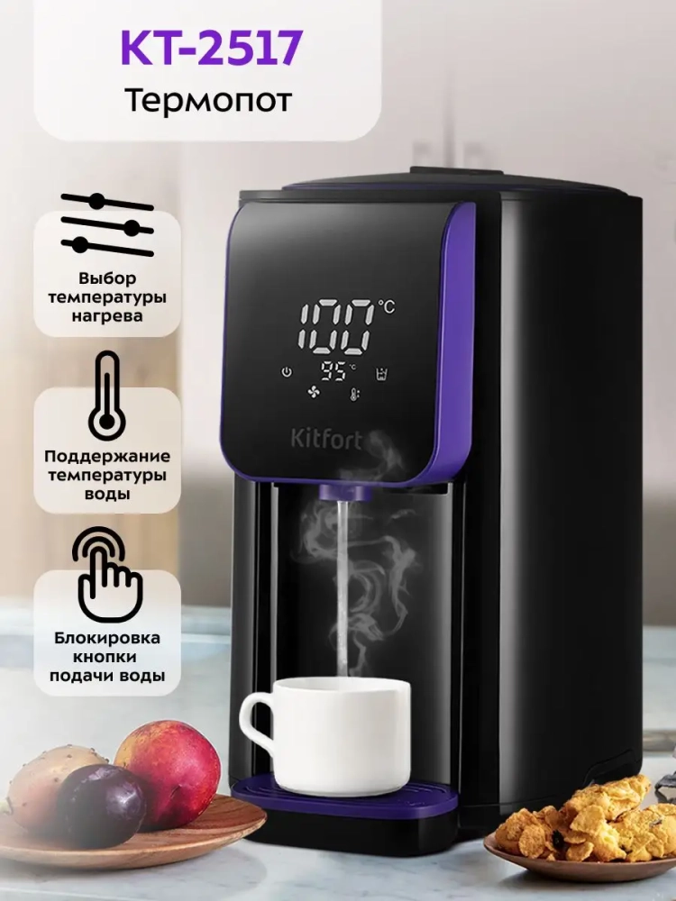 Термопот Kitfort КТ-2517 служит для подачи воды заданной температуры и поддержания температуры воды с помощью периодического включения и отключения нагрева. Отличие термопота от обычного чайника в том, что термопот поддерживает заданную температуру воды, поэтому у вас всегда есть горячая вода. Также удобно наливать воду благодаря автоматической подаче воды.
