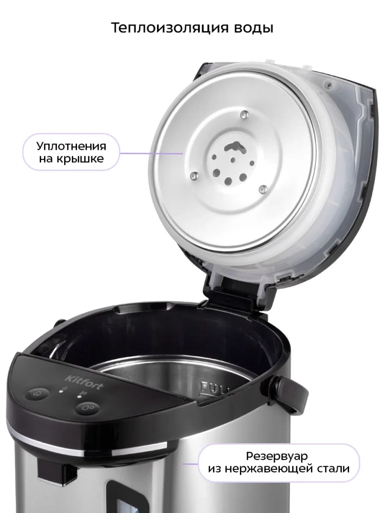 Термопот Kitfort КТ-2512 служит для кипячения и поддержания температуры воды с помощью периодического включения и отключения нагрева. Отличие термопота от обычного чайника в том, что термопот поддерживает температуру воды и у вас всегда есть горячая вода.