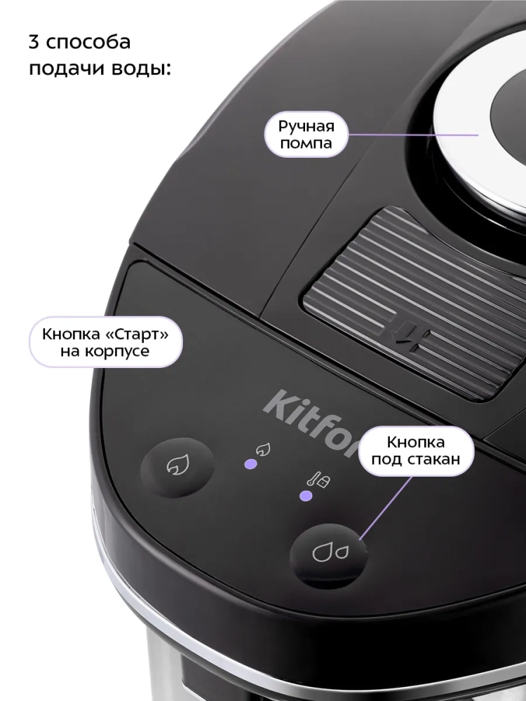 Подача воды осуществляется тремя способами: нажатием на кнопку «Старт», ручной помпой или нажатием кружки на специальный переключатель подачи воды, расположенный рядом с носиком термопота.