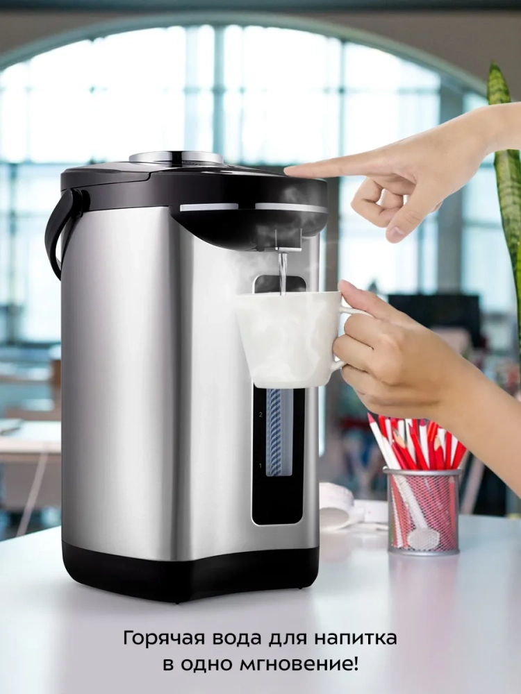Двойные стенки термопота помогают сохранить тепло и реже включать нагрев, что поможет сэкономить на электроэнергии. Корпус термопота состоит из пластика и нержавеющей стали, а резервуар — из нержавеющей стали. Внутренняя часть крышки также сделана из нержавеющей стали, поэтому вода не соприкасается с пластиковыми частями устройства.