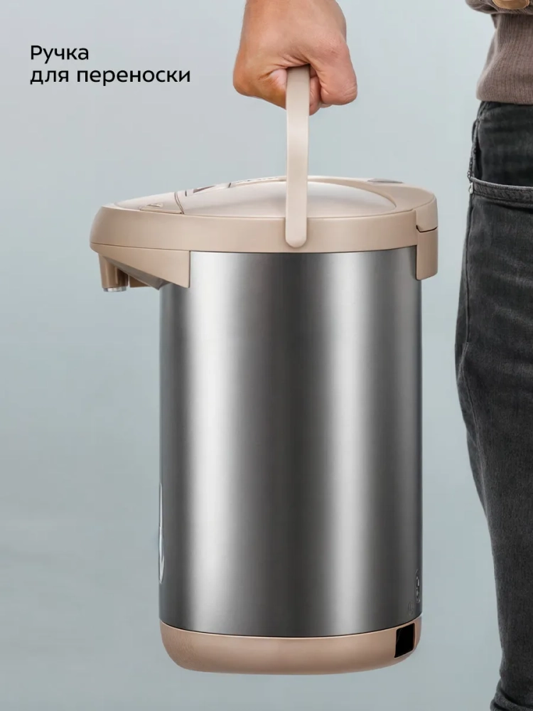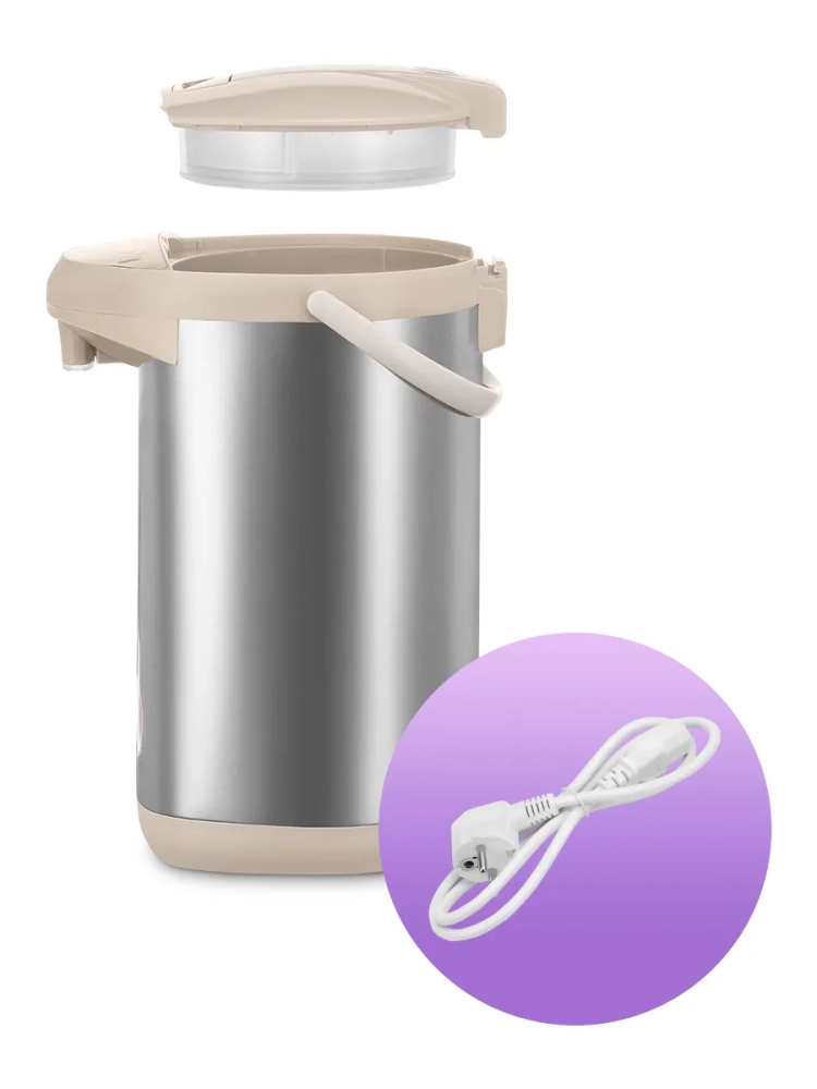 Двойные стенки термопота помогают сохранить тепло и реже включать нагрев, что позволяет экономить электроэнергию. Корпус термопота состоит из пластика и нержавеющей стали, а резервуар — из нержавеющей стали. Внутренняя часть крышки также сделана из нержавеющей стали, поэтому вода не соприкасается с пластиковыми частями устройства.
