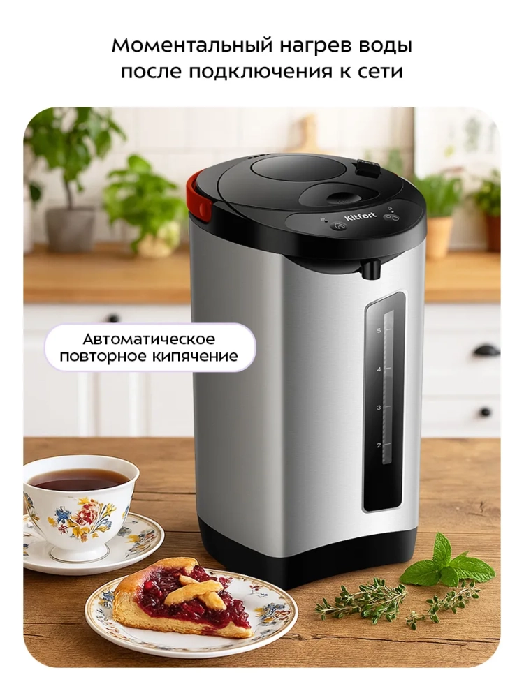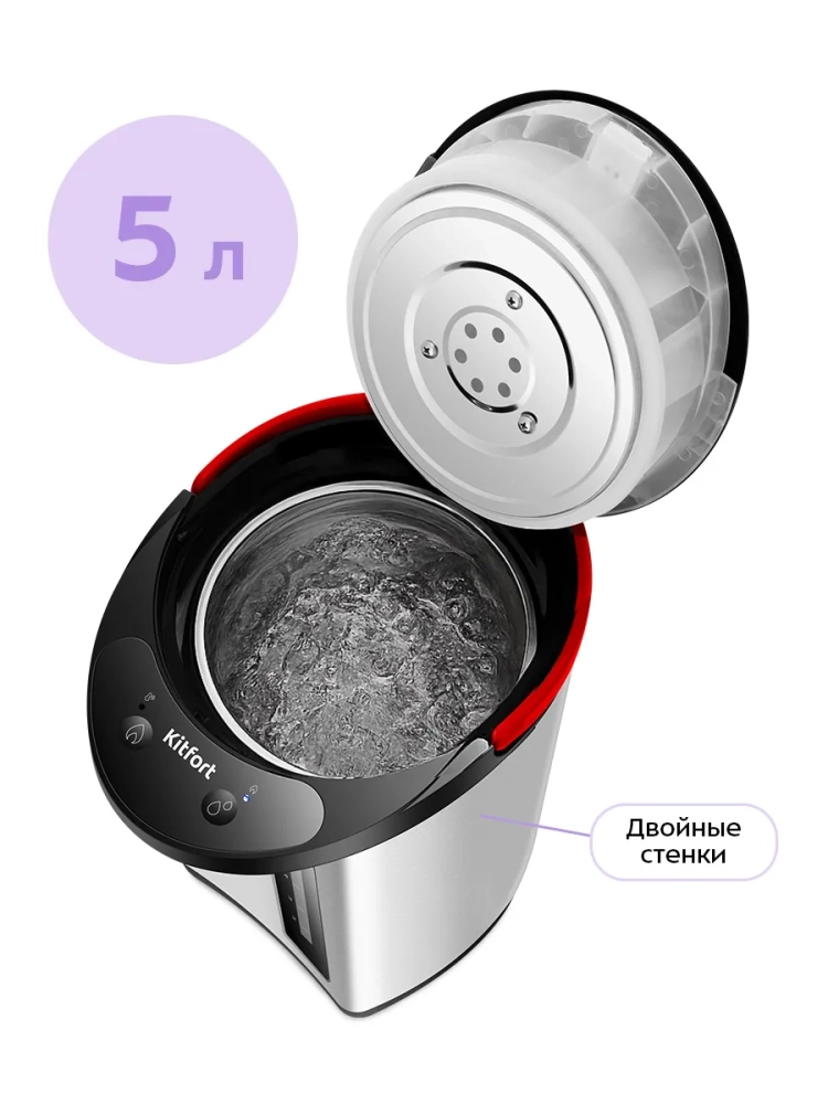 Термопот Kitfort КТ-2539 служит для кипячения воды и поддержания ее температуры с помощью периодического включения и отключения нагрева. Отличие термопота от обычного чайника в том, что термопот поддерживает температуру воды, поэтому она может оставаться горячей долгое время, если вам это необходимо.