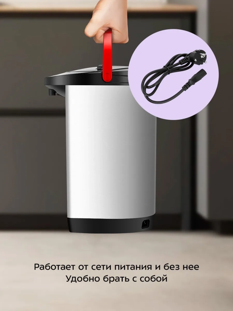 Термопотом можно пользоваться без подключения к сети. В этом случае, чтобы налить воду, используется ручная помпа. Вы можете использовать ручную помпу для удобной подачи воды комнатной температуры, или вскипятить воду в термопоте, когда он подключен к сети, затем отключить устройство от сети и установить термопот в месте, где нет доступа к электросети. Благодаря двойным стенкам резервуара вода в термопоте будет остывать достаточно медленно.