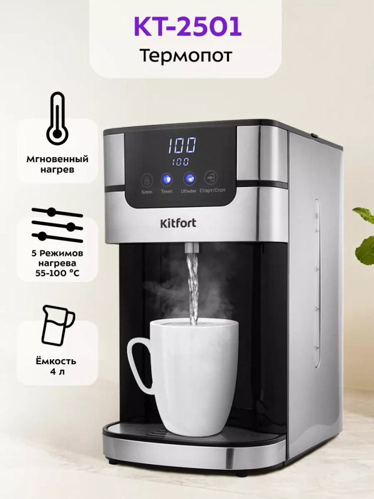 Термопот Kitfort КТ-2501 служит для моментальной подачи воды заданной температуры без предварительного подогрева и ожидания. Термопот не потребляет электричество в режиме простоя. Подогрев осуществляется проточно, подача воды начинается в течение примерно 5 секунд после нажатия кнопки – столько времени занимает нагрев до температуры кипения.