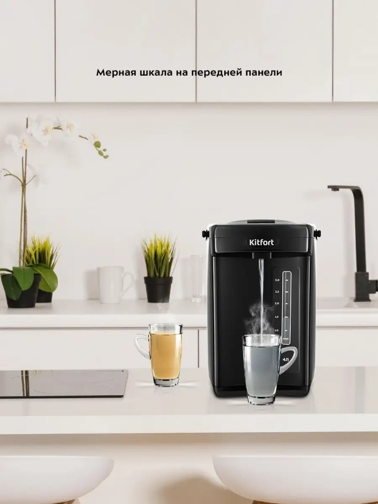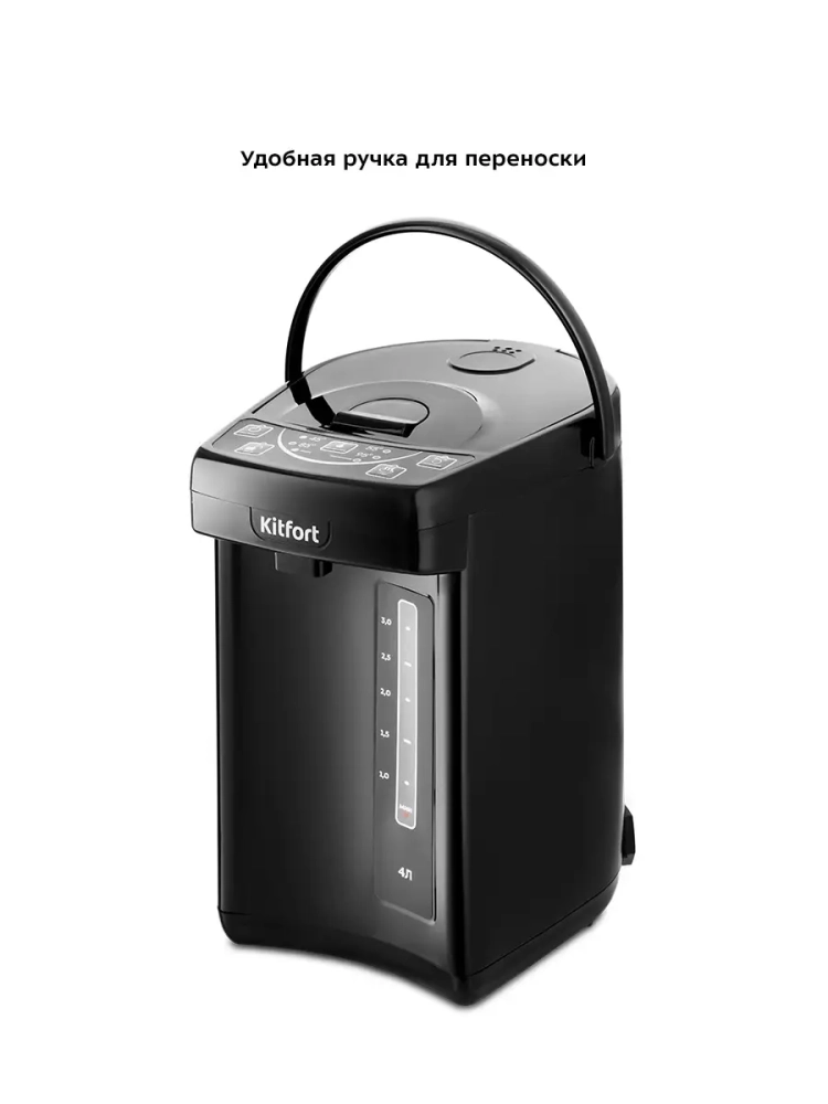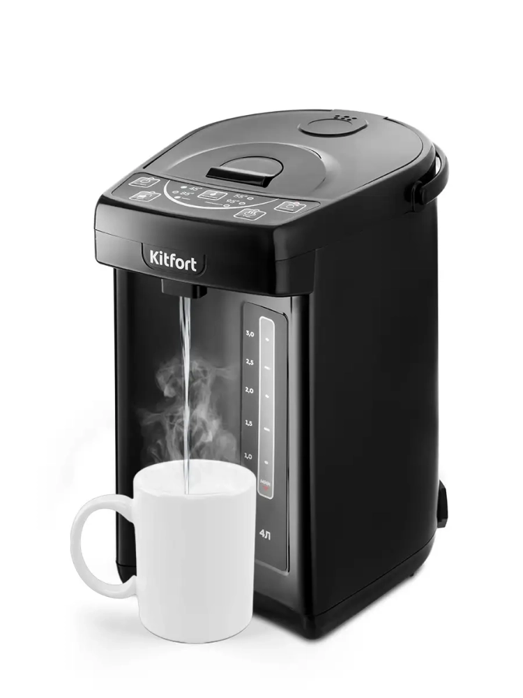 Термопот Kitfort КТ-2508 служит для кипячения и поддержания температуры воды на заданном уровне с помощью периодического включения и отключения нагрева. Термопот Китфорт оснащен функцией выбора температуры и может не только вскипятить воду, но и нагреть ее до температуры 45, 55, 85, 95 *С, что очень удобно при заваривании различных сортов чая, приготовлении кофе и подогрева детского питания. Термопот также оснащен функцией поддержания температуры. Температура воды контролируется термодатчиком, встроенным в дно резервуара для воды. Термопот будет держать установленную температуру, пока его не отключат. Термопот имеет двойные стенки для сохранения тепла и экономии электроэнергии. Корпус термопота состоит из окрашенной нержавеющей стали и вставок из пластика. Функция Замок не позволит получить ожог при случайном включении, а также защитит от случайных нажатий на кнопки детьми. Термопот поддерживает выбранную температуру и у вас всегда в готовности горячая вода.