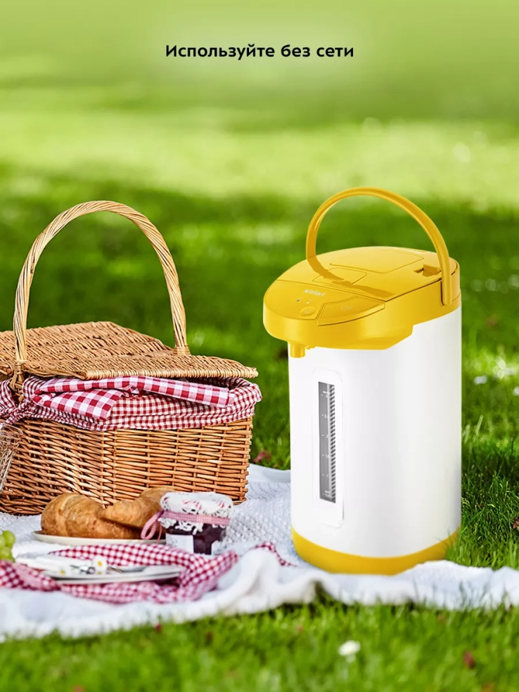 Термопотом можно пользоваться без подключения к сети. В этом случае, чтобы налить воду, используется ручная помпа. Вы можете использовать ручную помпу для удобной подачи воды комнатной температуры или вскипятить воду в термопоте, когда он подключен к сети, затем отключить устройство от сети и установить термопот в месте, где нет доступа к электросети. Благодаря двойным стенкам резервуара вода в термопоте будет остывать достаточно медленно. Скорость понижения температуры в резервуаре зависит от температуры окружающей среды.