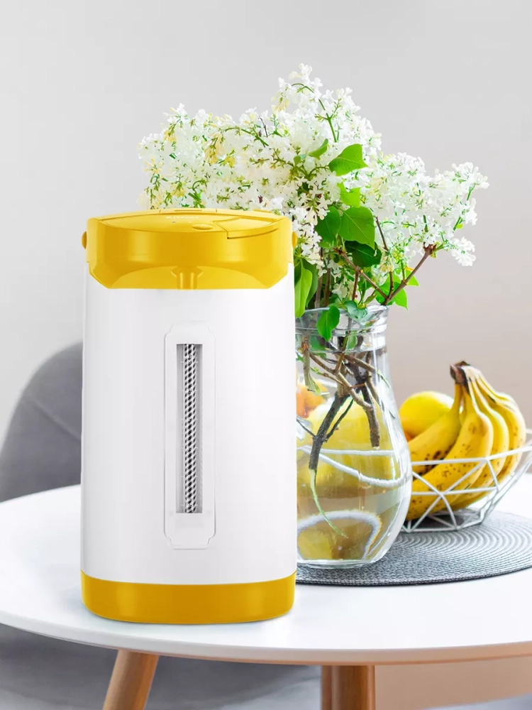 Двойные стенки термопота помогают сохранить тепло и реже включать нагрев, что поможет сэкономить на электроэнергии. Корпус термопота состоит из пластика и нержавеющей стали, а резервуар — из нержавеющей стали. Внутренняя часть крышки также сделана из нержавеющей стали, поэтому вода не соприкасается с пластиковыми частями устройства.