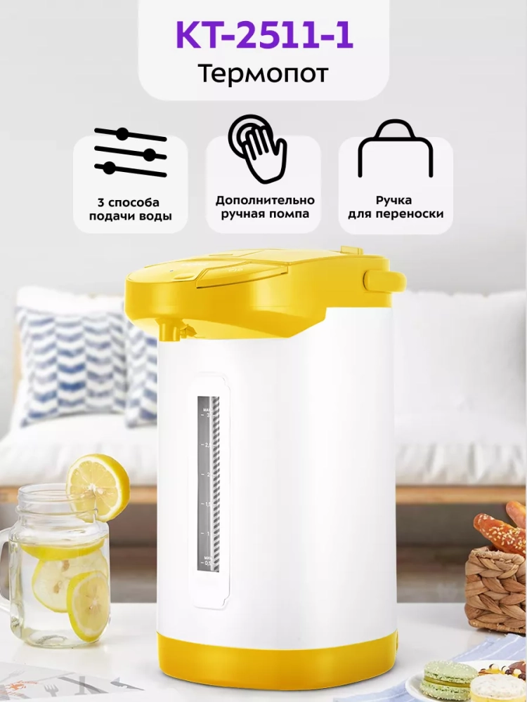 Термопот Kitfort КТ-2511 служит для кипячения и поддержания температуры воды. Отличие термопота от обычного чайника в том, что термопот поддерживает температуру воды и у вас всегда есть горячая вода.